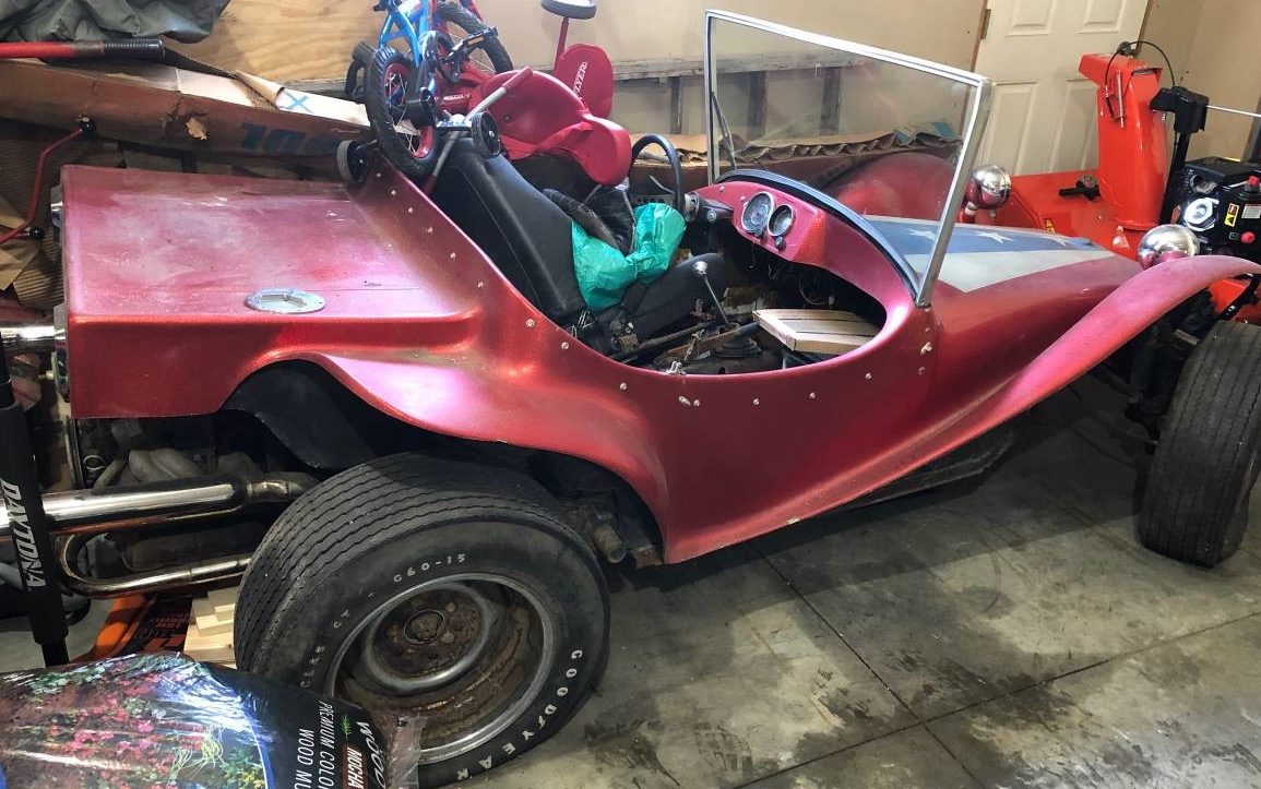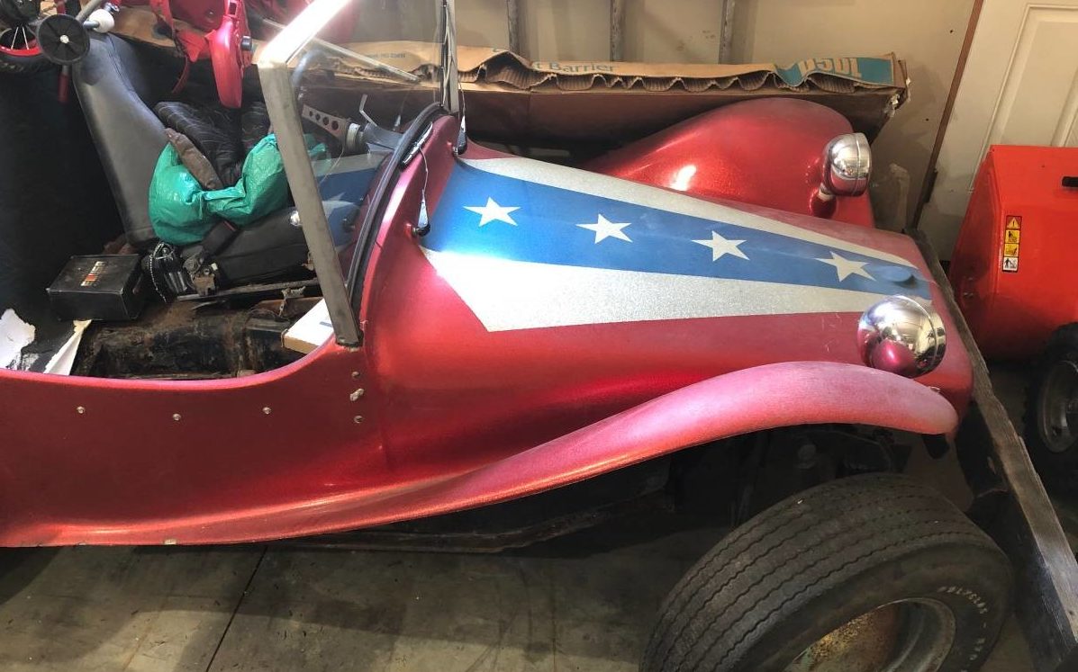 The seller’s details on this buggy are light – been in the family a long time, was going to finish it but stuff happened, rolls but barely, missing seats, it’s a project. The exterior has a stars/flag motif and the fiberglass appears to be in sound shape. Seller states that he has no paperwork on it so there is no indication of who made the body – perhaps a dune buggy aficionado will recognize it and can make an identification. He also states that it needs tires and the rims should be refinished. I’m not sure I’d bother refinishing chrome-reverse wheels but the Goodyear Polyglas GT tires will probably hold some interest for the collector of something else. There is a seat of some sort haphazardly tossed inside but the seller says that seats are among the missing parts.