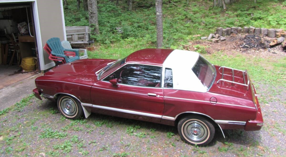 You can fit 4 people in 1 of these & even a pinto! Try that with today’s modern pony cars. & it’s got properly sized side windows, a color keyed interior(no grey here!) & the ford racing mirrors(mounted where they are supposed to be mounted!) – instead of “modern” ugly cheap JCW looking plastic ones that started in ’79. I would have preferred the more glass non opera side windows & no vinyl roof & no luggage rack, but one has mighty slim pickens today,