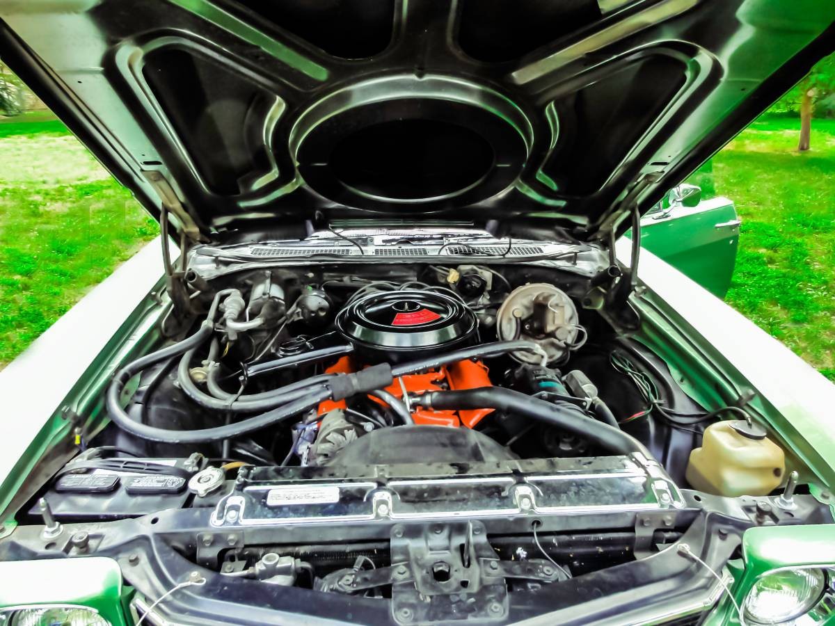 I like the green paint along with the stripes, it’s not a bad looking car on the outside really. The interior blows for me though, a black interior or even a white interior would make a nice contrast with the paint, plus it looks too ordinary for a car pretending to be a muscle car. Would have liked to seen a 454 in there…hey its already got the knock on having four doors and a boring interior, might as well back it up with some real💪💪💪!
