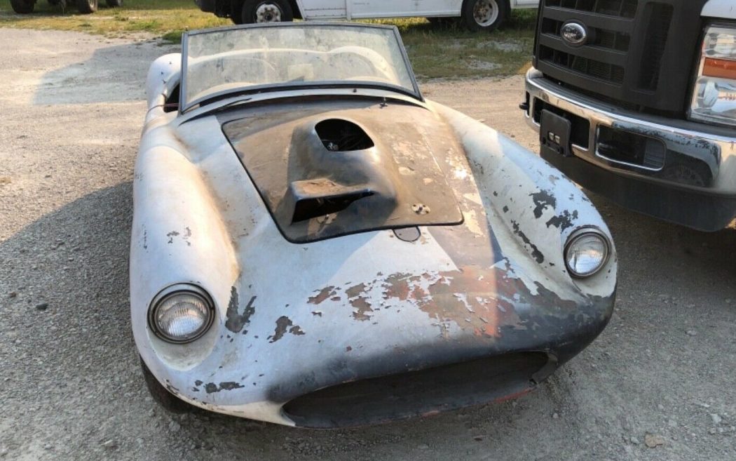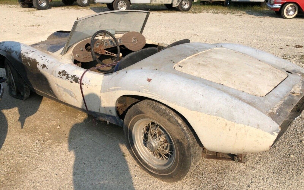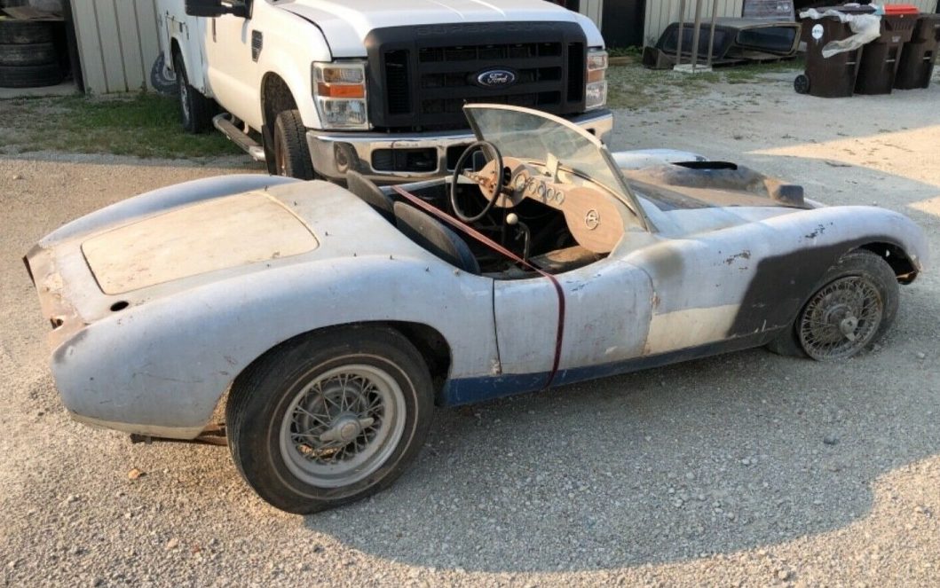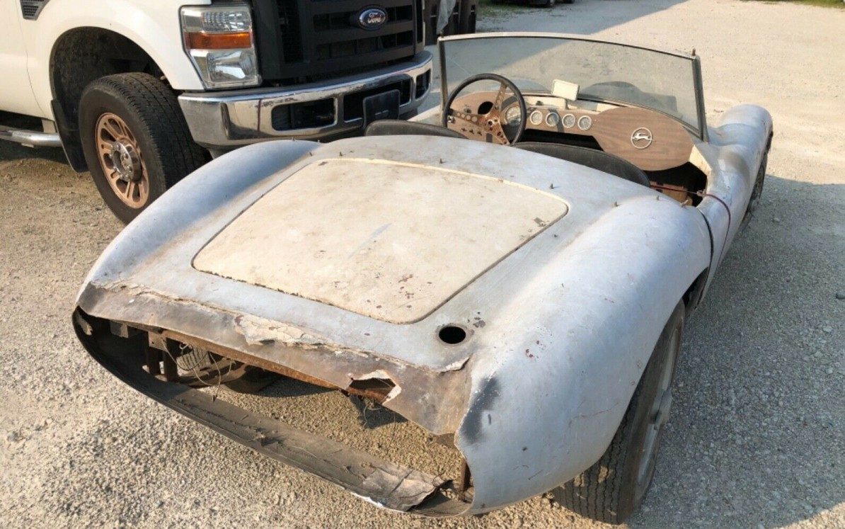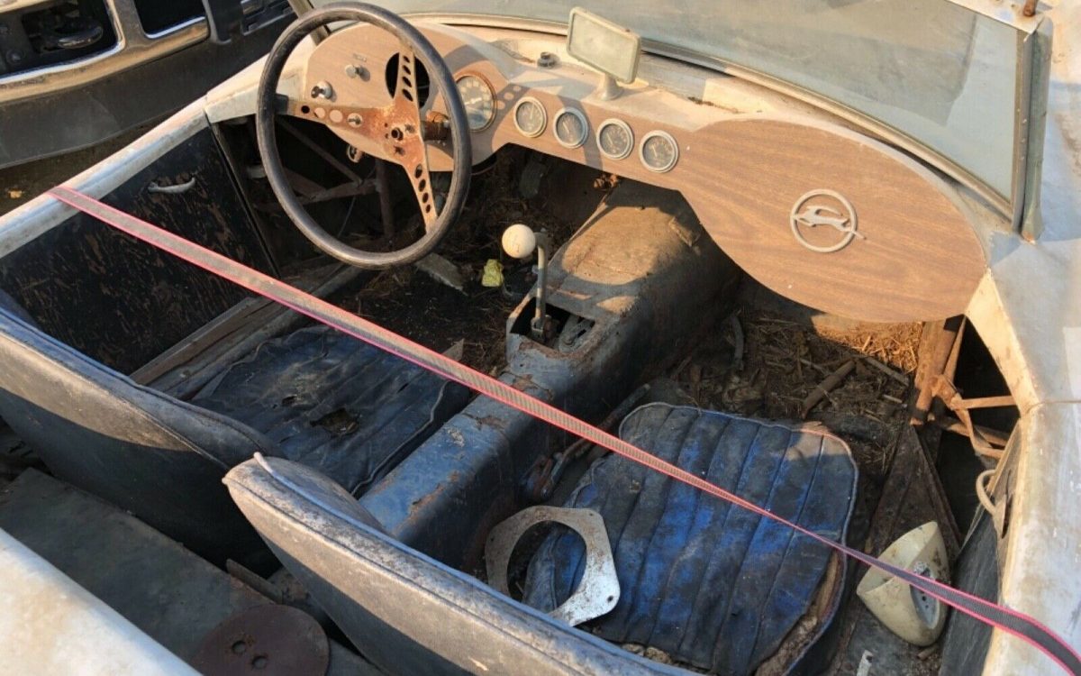 The seller states that “This car has not been on the road for many years“. That seems self-evident based on the images provided. The trim and bumpers are missing and the fiberglass body looks rough. I’m not sure what the strap across the interior compartment does, but it would seem to be holding something together. Devin bodies were known for their fiberglass durability and quality. Unfortunately, the fiberglass body here is flaking away in places with chunks missing – it’s going to need a lot of help. The wire wheels are dingy but they’re a nice inclusion and can be refinished to a like-new condition. Note the old rear bias-ply rear tires with the narrow white stripes – they were purchased back in the day when they could be acquired almost anywhere as opposed to having to go, today, to a certain specialty manufacturer that charges about $275 fa piece for reproductions.