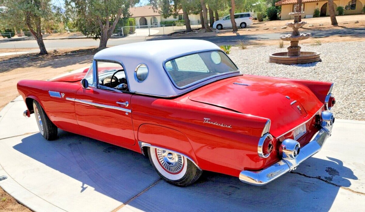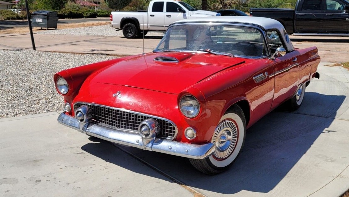 For as long as I can remember, I’ve had a thing for cars and guitars, especially electric guitars. I guess it’s because both have styling, color, performance, and a full range of sound going for them. Plus, both cars and guitars can be left factory original and “bone stock” or modified to the owners content. Here’s a classic ’55 Thunderbird that has been modified inside, outside, and especially under the hood. It’s now powered by a legendary Chevy 350-cubic inch small block V8 (the original engine and transmission come with the sale). Nesting in the sun in Apple Valley, California, this ’55 Red ‘Bird is for sale here on eBay where the highest bid sits at $16,900 as of this writing.