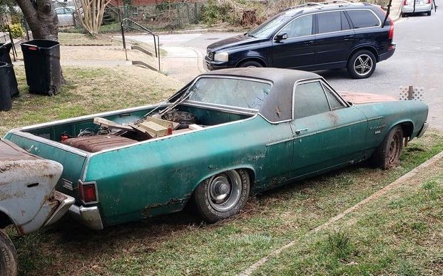Based on the Spring Green color, I’m going to call this El Camino a 1972 model – getting a good look at the front is the only way to discern it from a 1971 model. The watchword here is rust. It is evident in the passenger side quarter and under the vinyl top covering – never a good sign. It’s pretty well down on its haunches which may be due to an overloading of detritus in the cargo bed or a more serious suspension problem.
