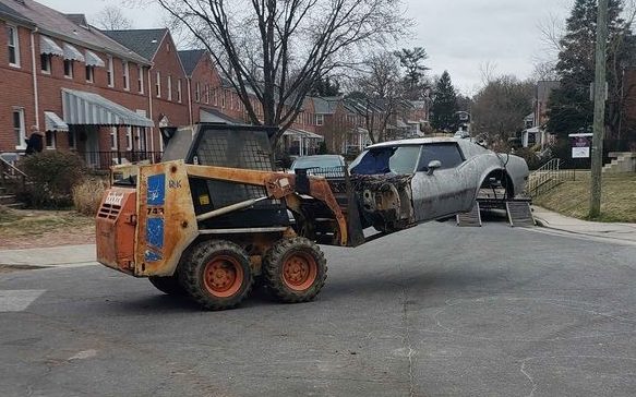 This mid-’70s Corvette is about to get a lift – in a big way as a forklift bears down on it and plucks it up. This is another Chevy with hot-rod intentions as evidenced by its air cleaner and what’s left of its driver’s side chrome exhaust. It would be nice to know what happened to the hood but I guess it really doesn’t matter.