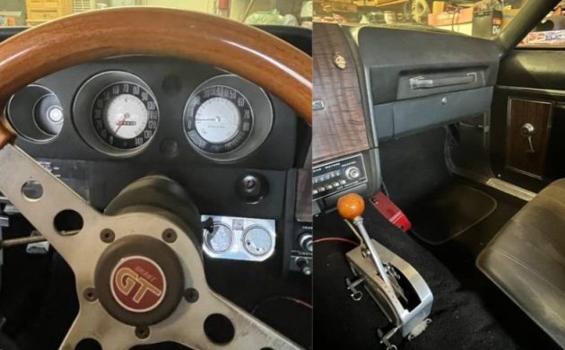 Idle for a number of years, the car seems to be in good shape. The open trunk lid suggests the original color of the auto was dark green, replaced by grey (primer?). We’re told the machine had a current registration, but we don’t know how recently it was active. If you’re interested in a fun car for the local track, could this AMC/Chevy AMX fit the bill?