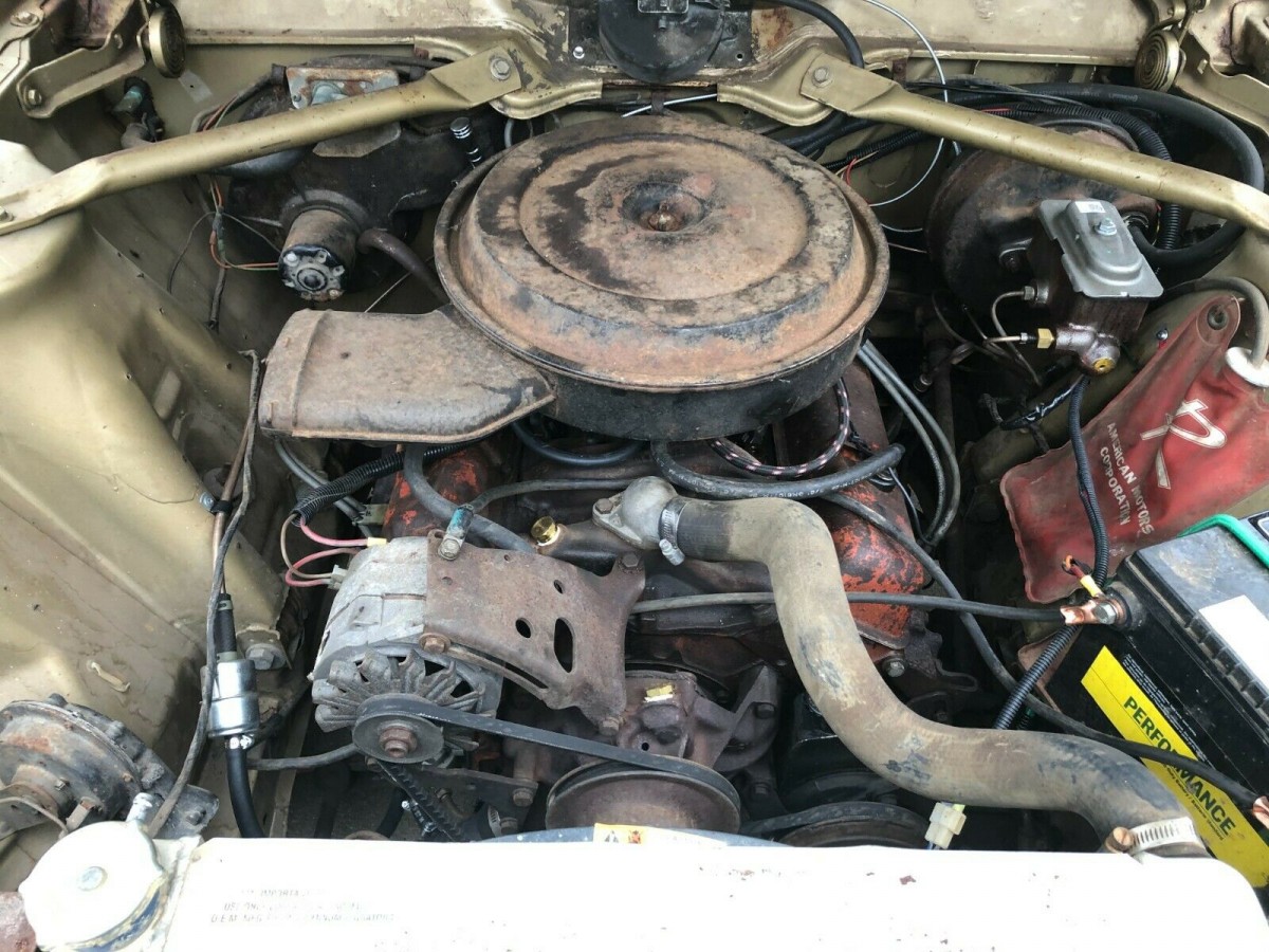 This 1964 Classic 770 looks like a nice survivor, but it has had one major modification over the years. The engine, which likely was a Rambler 287 cubic inch V-8, has been replaced with a small-block Chevy motor, the venerable 350. The 287 had the distinction of being the first eight cylinder-engine that AMC designed and built. Besides the motor, the transmission has been swapped out with a GM 350 Turbo-Hydramatic. Other mechanical upgrades or repairs include an aluminum radiator with electric fan, brakes lines, and wheel cylinders, master brake cylinder, fuel lines, and front tires. The seller refers to the car having ladder bar rear suspension with coil springs front and rear, but I don’t know if he means these have been refreshed or just stating a fact. The car carries a Jeep wide-track rear differential with a one-piece axle.