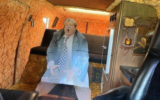 Weeeeeellll, I loved Chris Farley. From Madison, Wis. don’t you know, but to have a van as a tribute, is a bit much. I watched a documentary with Farleys dad and brothers. They all agreed, he was a very troubled child. It’s clear, he did everything in excess, and one day, it killed him. I’m not sure that’s the kind of hero I’d want emblazoned on the side of a van. The van itself is a cool rig, even the not often seen, little left footie for the bright lights, but please, lose the Farley graphics.