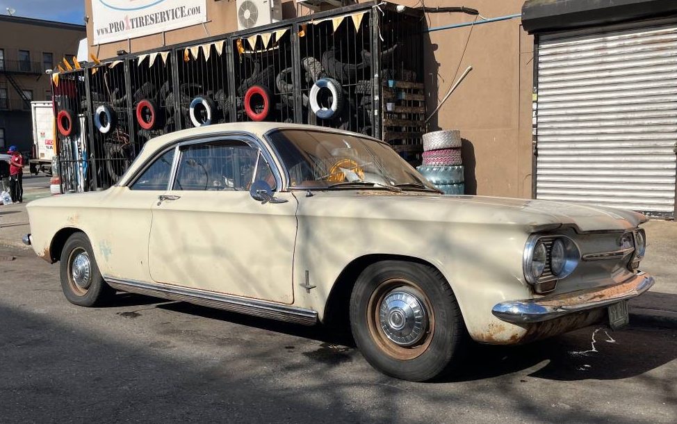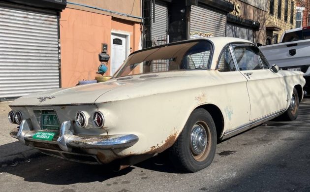 The advent of the VW Beetle shook the US auto industry to its core – but not right away. The car was tiny, tinny, and its tail was full of motor. Sales were slow until in 1959, VW’s “Think Small” advertisement reminded folks they were tired of girthy American fare. The first American car company with a competitor on the ground was Chevrolet, who was willing to copy the rear-engine configuration in a compact-ish package. (Anyone know what car Ford made, also in response to the Beetle, but which never saw production? Here’s a hint.) The Corvair was introduced in 1960; more than 1.8 million were sold before the model was phased out in 1969. Body styles ranged from the hip Lakewood wagon to the Rampside pickup, from a four-door sedan to the sexy Monza Spyder. Here on craigslist is a 1963 Chevrolet Corvair Monza, priced at $3000. This car has been plying the streets of Brooklyn, New York – a rough life for sure; Mitchell G found the ad for us.