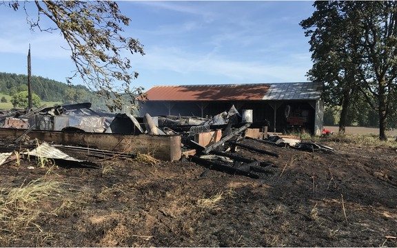 Here you can see the remnants of the 4,000 square-foot barn along with another outbuilding. The cars destroyed in the fire were a 1967 Chevelle, 1967 El Camino and a 1956 Chevy as well as a utility truck parked beside it. Due to the location of the property, there were no fire hydrants in the area and water had to be brought in to fight the fire. Winds caused the fire to spread to the neighboring property where secondary fires were ignited.