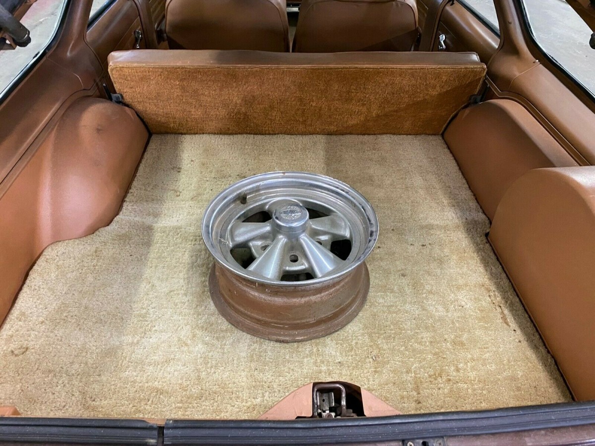 I’d much rather have this than that money pit 74 Pinto Squire from Barn Finds the other day. Some of the same characteristics, but much better condition and this one runs out on those Cragars and wide paws! Won’t be using the spare on the side of the road though, its just a wheel sans tire. Ouch!
