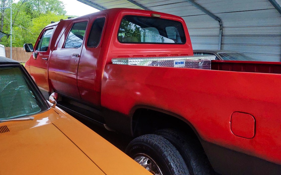 This thing is an absolute beast! Reid states that the chassis is from a Dodge Ram 3500, but there’s no word on what year. The back half of the cab and bed appears to be from a late ’70 Dodge Adventurer, but the lack of fender flares suggests the bed might be from a non-dually truck. And to make things even more interesting, the engine is a 360 V8 paired to a 727 automatic. Some further investigating will be needed to determine what vintage the various components are and how they are put together, but one thing is for sure, this thing should be able to tow just about anything you want to hitch to it!