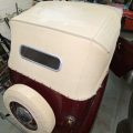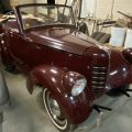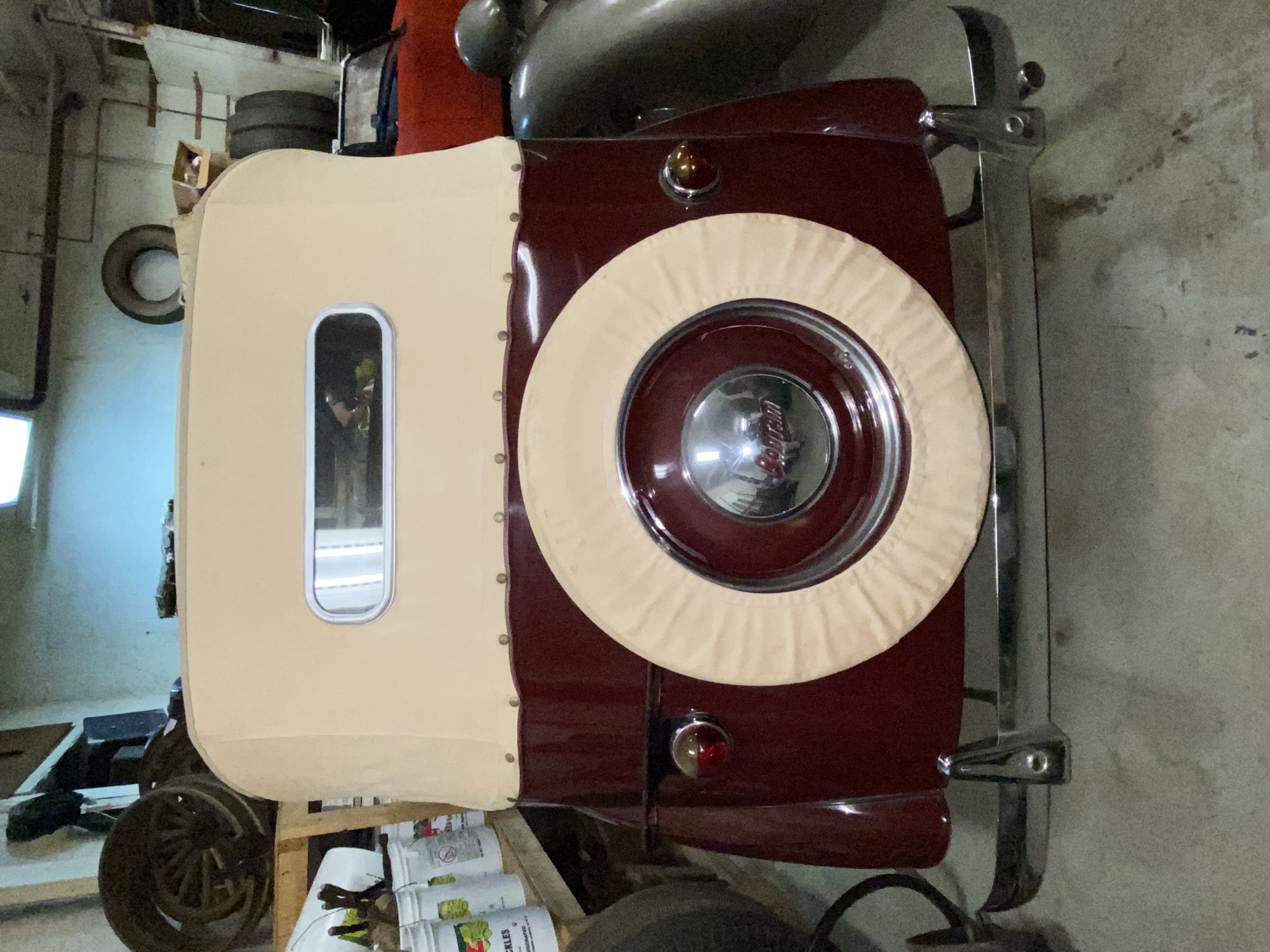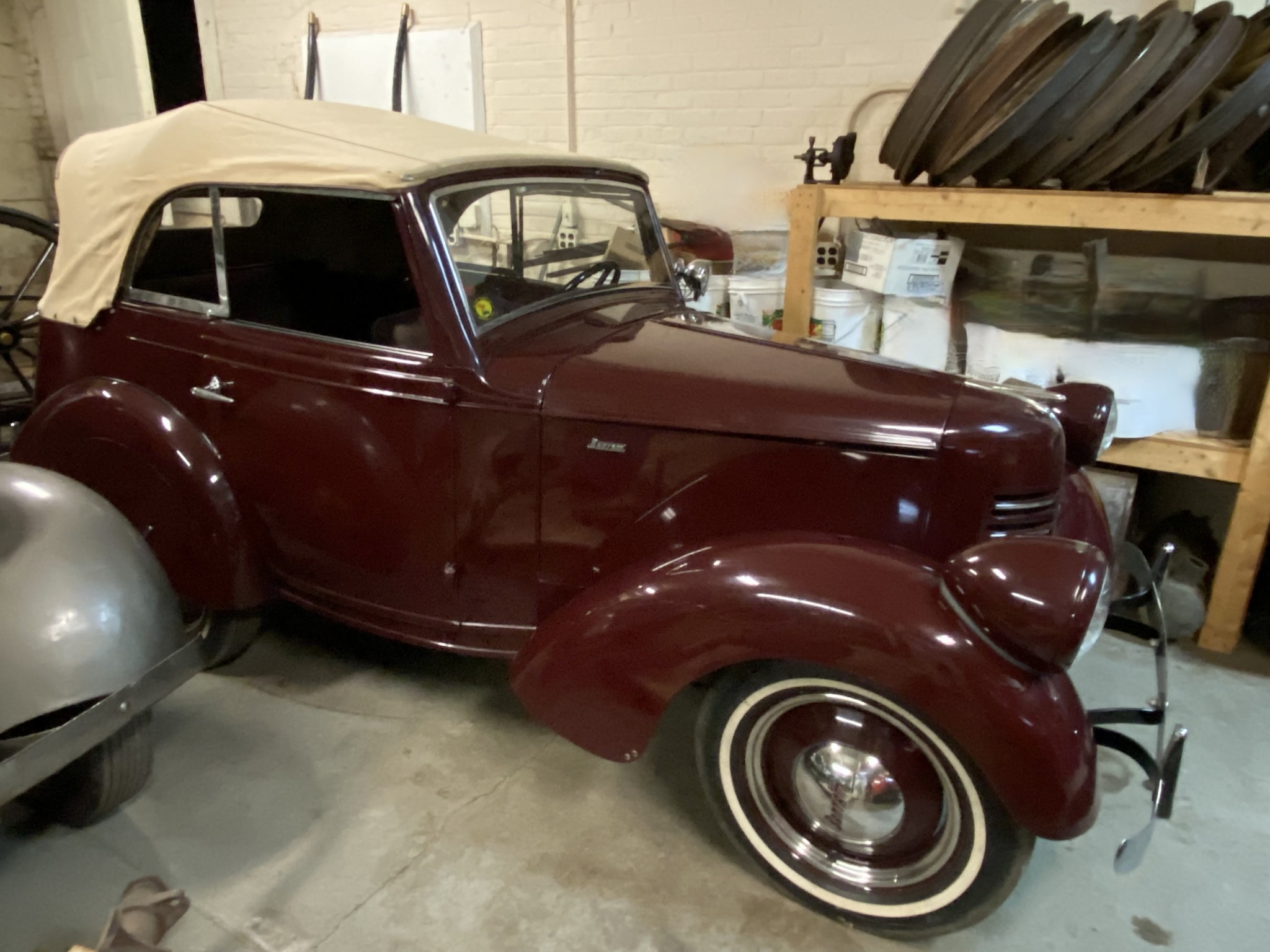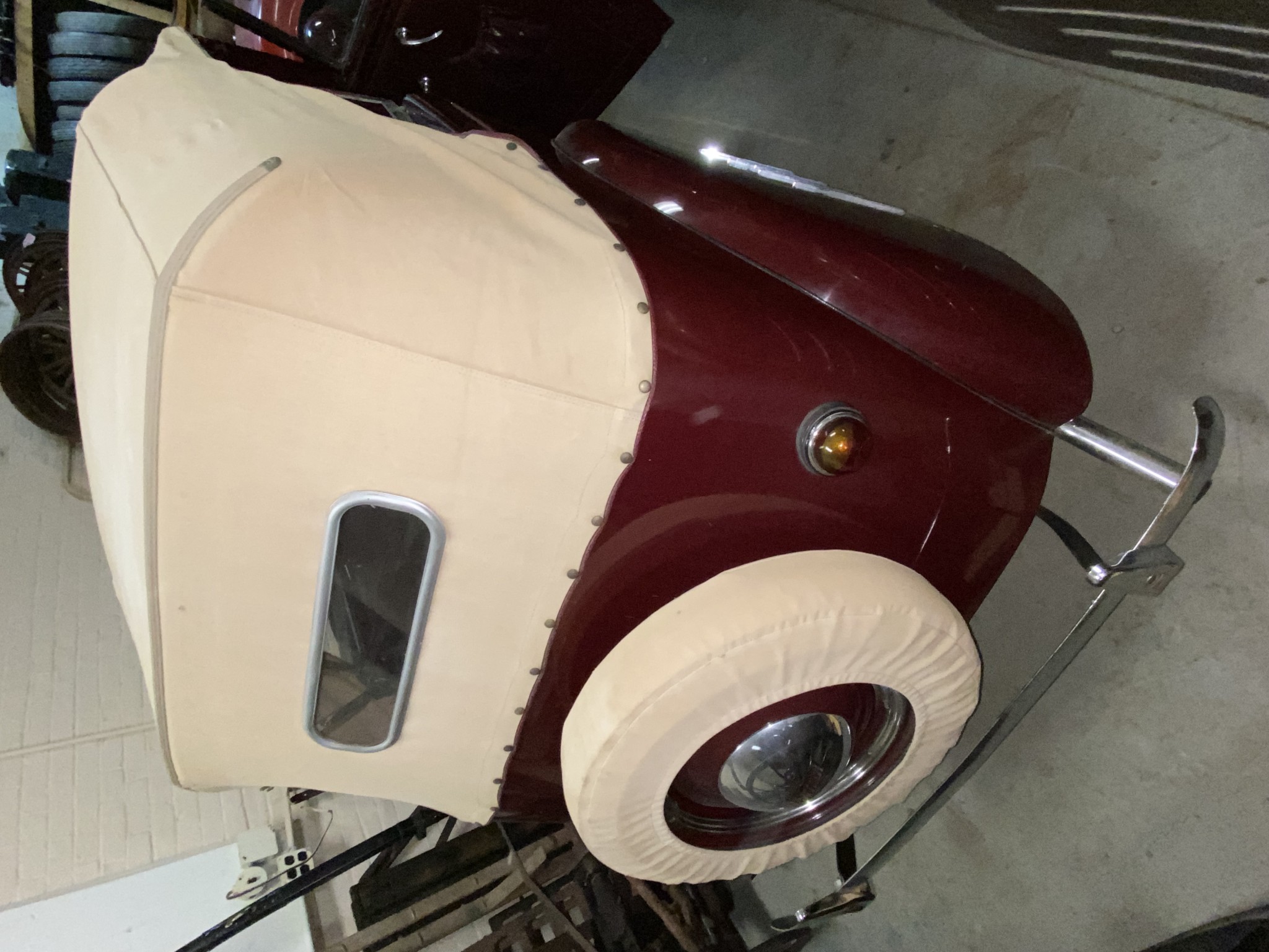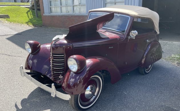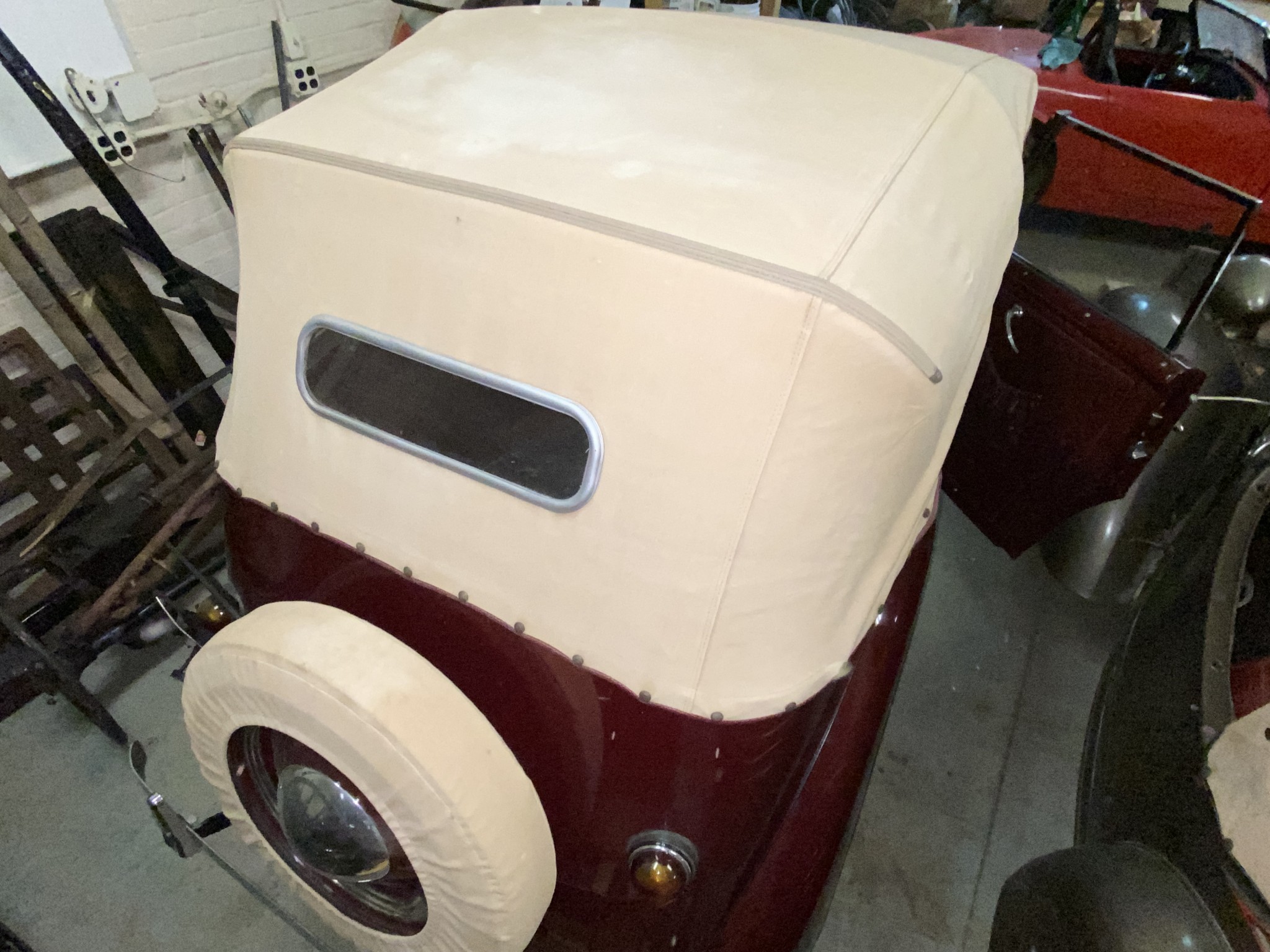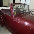 Seller’s Description: Nicely restored American Riviera Hollywood done in burgundy over burgundy interior with cream faced gauges. Excellent cream top with burgundy piping and glass rear window. Rear mounted spare, with spare tire cloth cover in matching cream fabric.