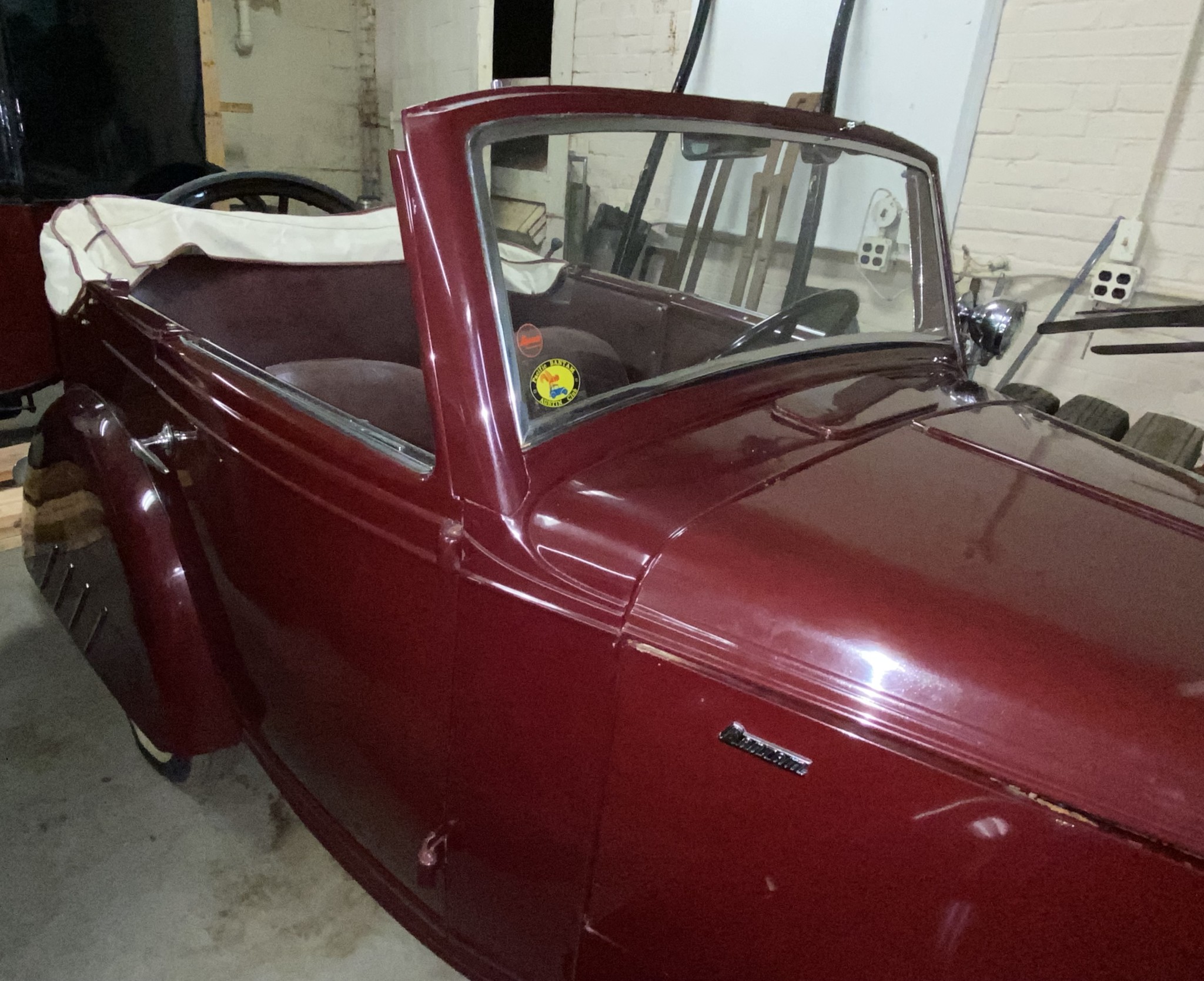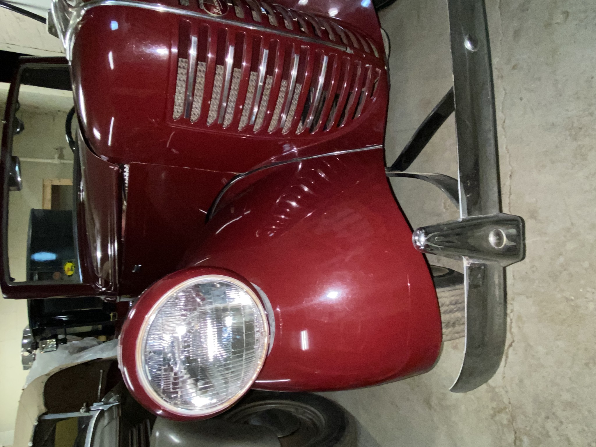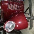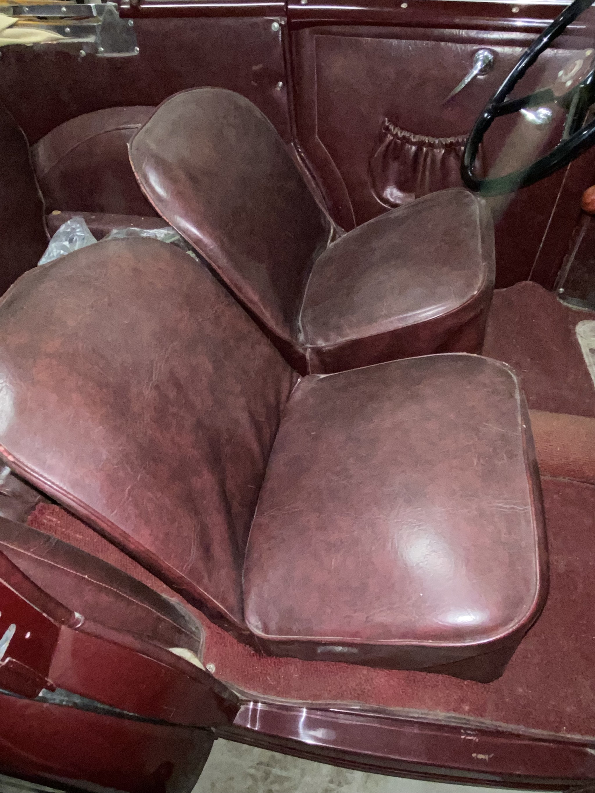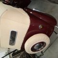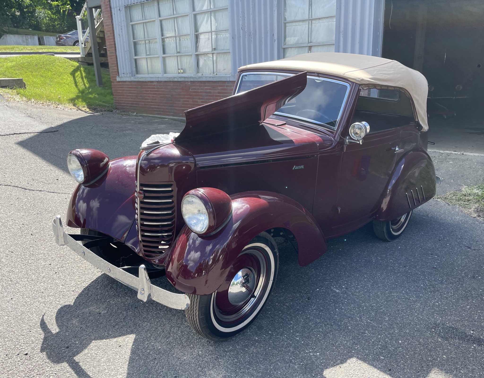 Seller’s Description: Nicely restored American Riviera Hollywood done in burgundy over burgundy interior with cream faced gauges. Excellent cream top with burgundy piping and glass rear window. Rear mounted spare, with spare tire cloth cover in matching cream fabric.