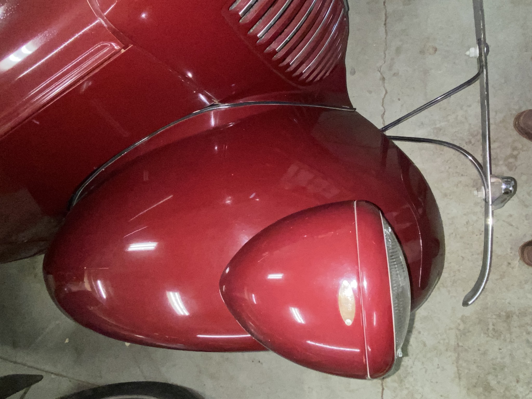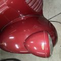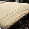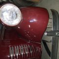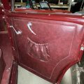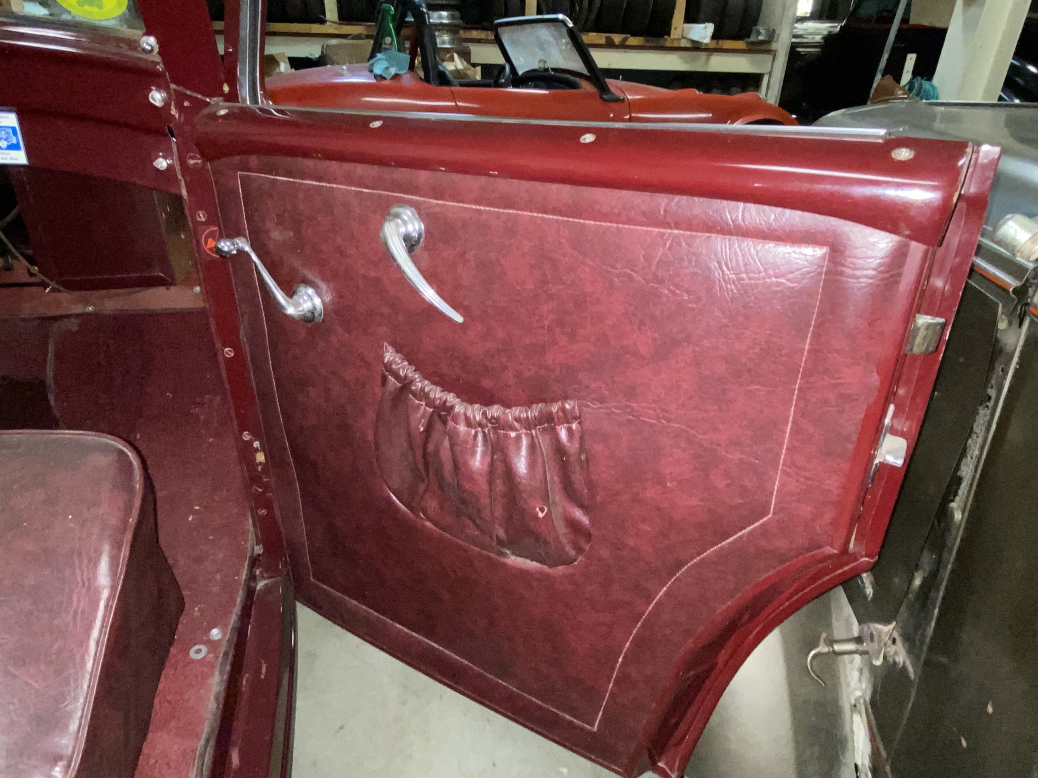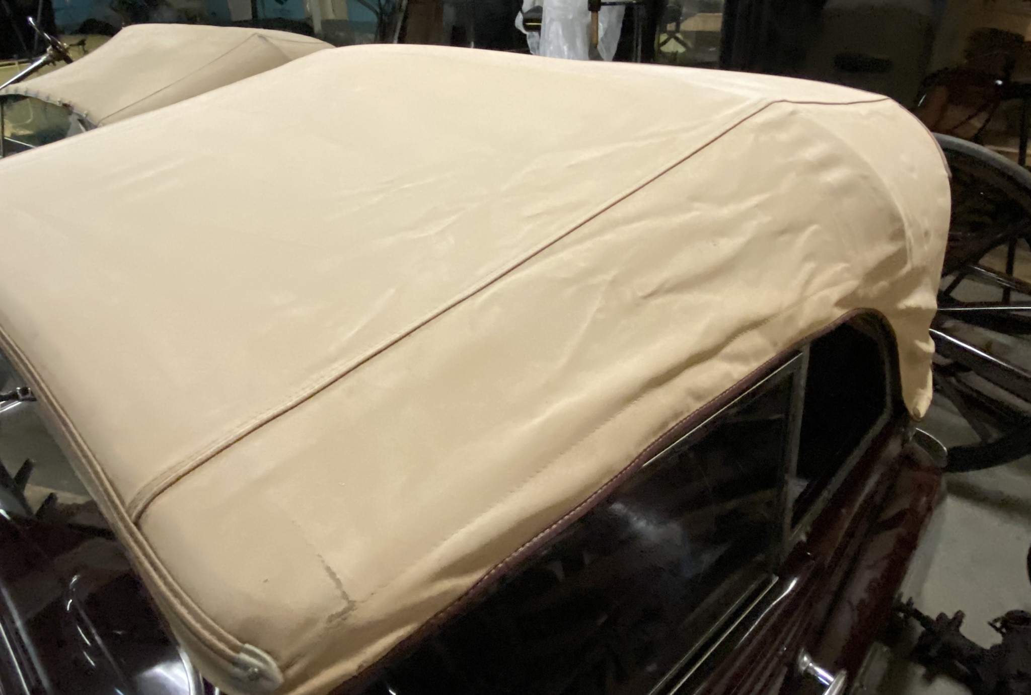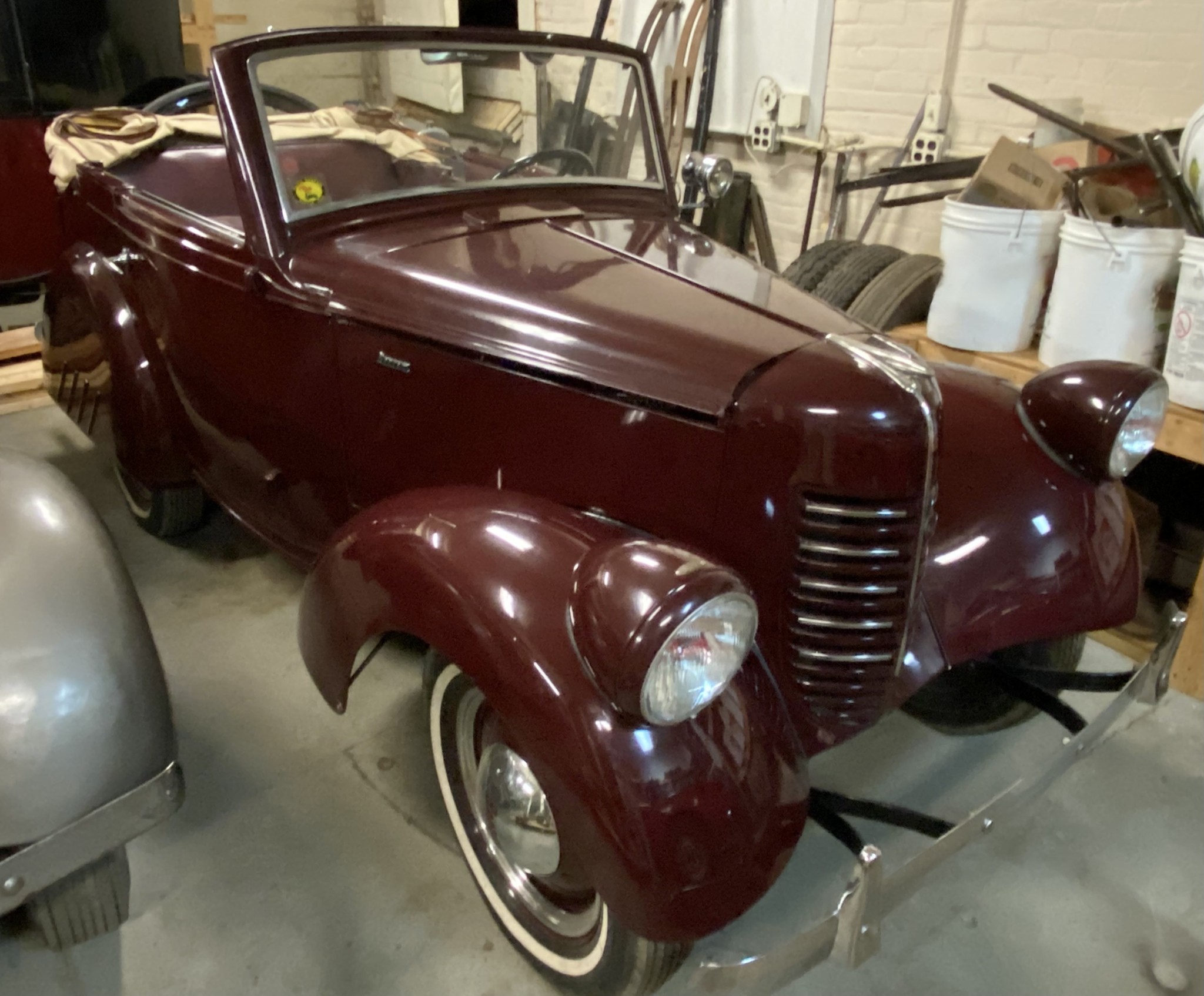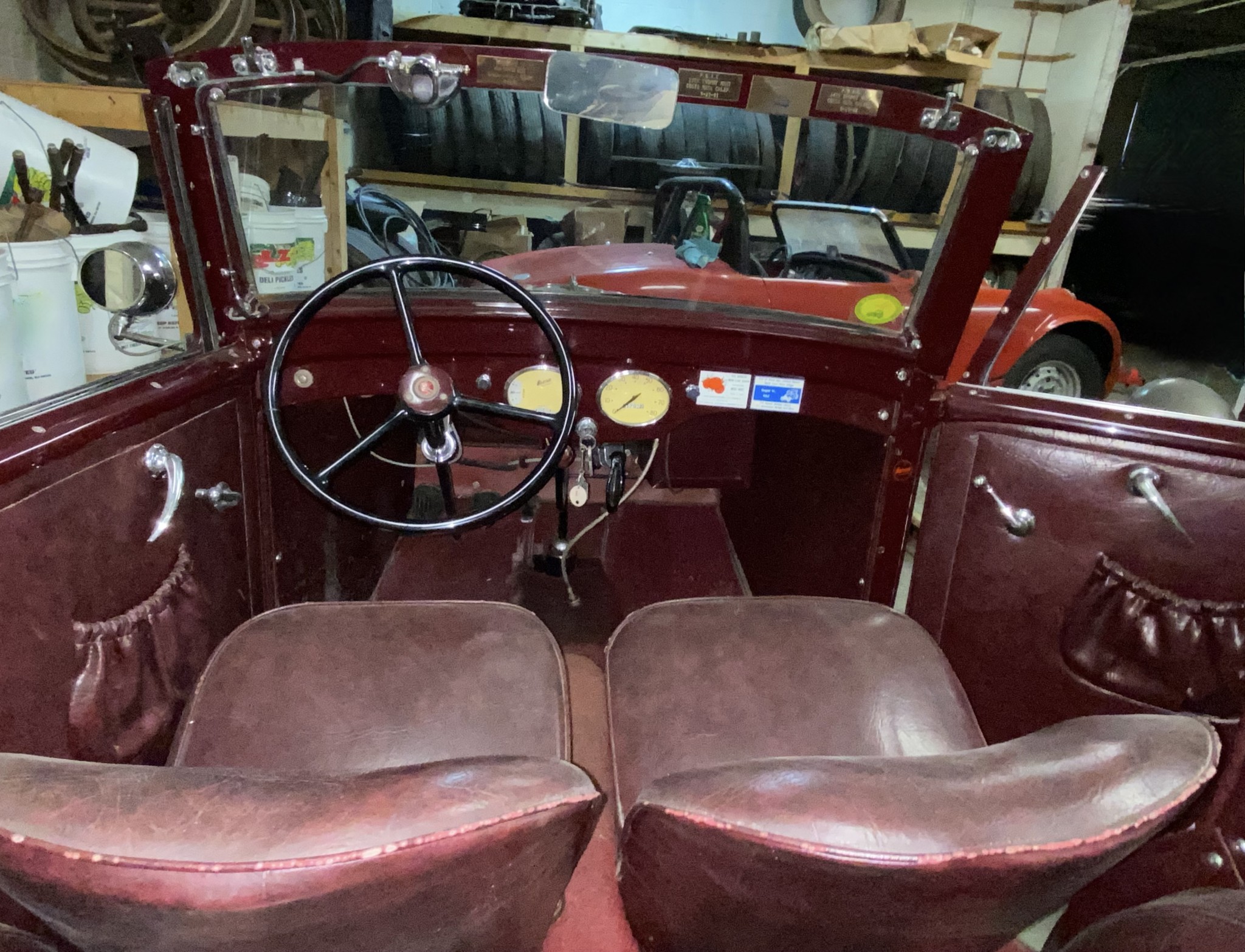 Seller’s Description: Nicely restored American Riviera Hollywood done in burgundy over burgundy interior with cream faced gauges. Excellent cream top with burgundy piping and glass rear window. Rear mounted spare, with spare tire cloth cover in matching cream fabric.