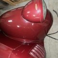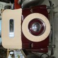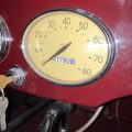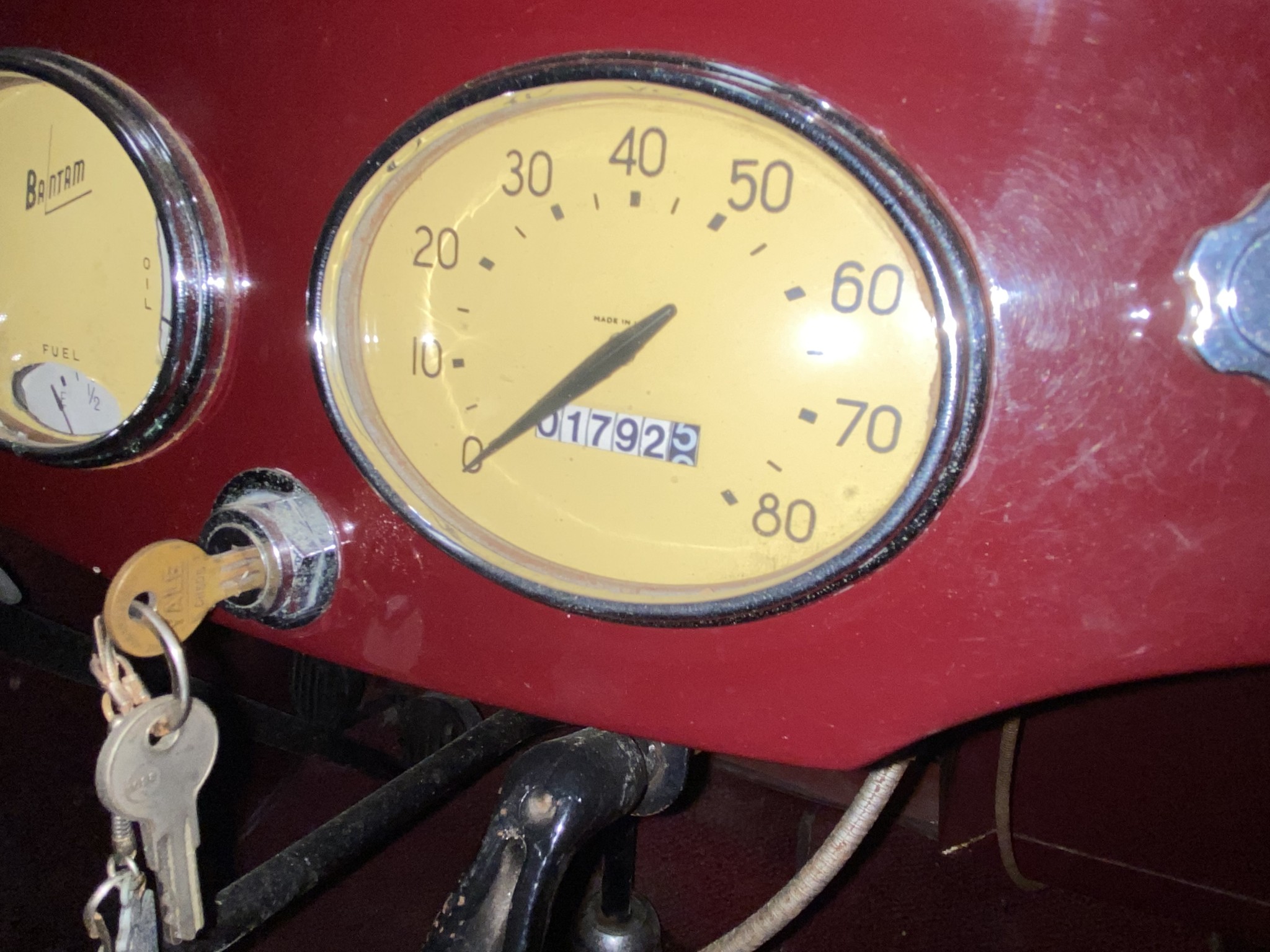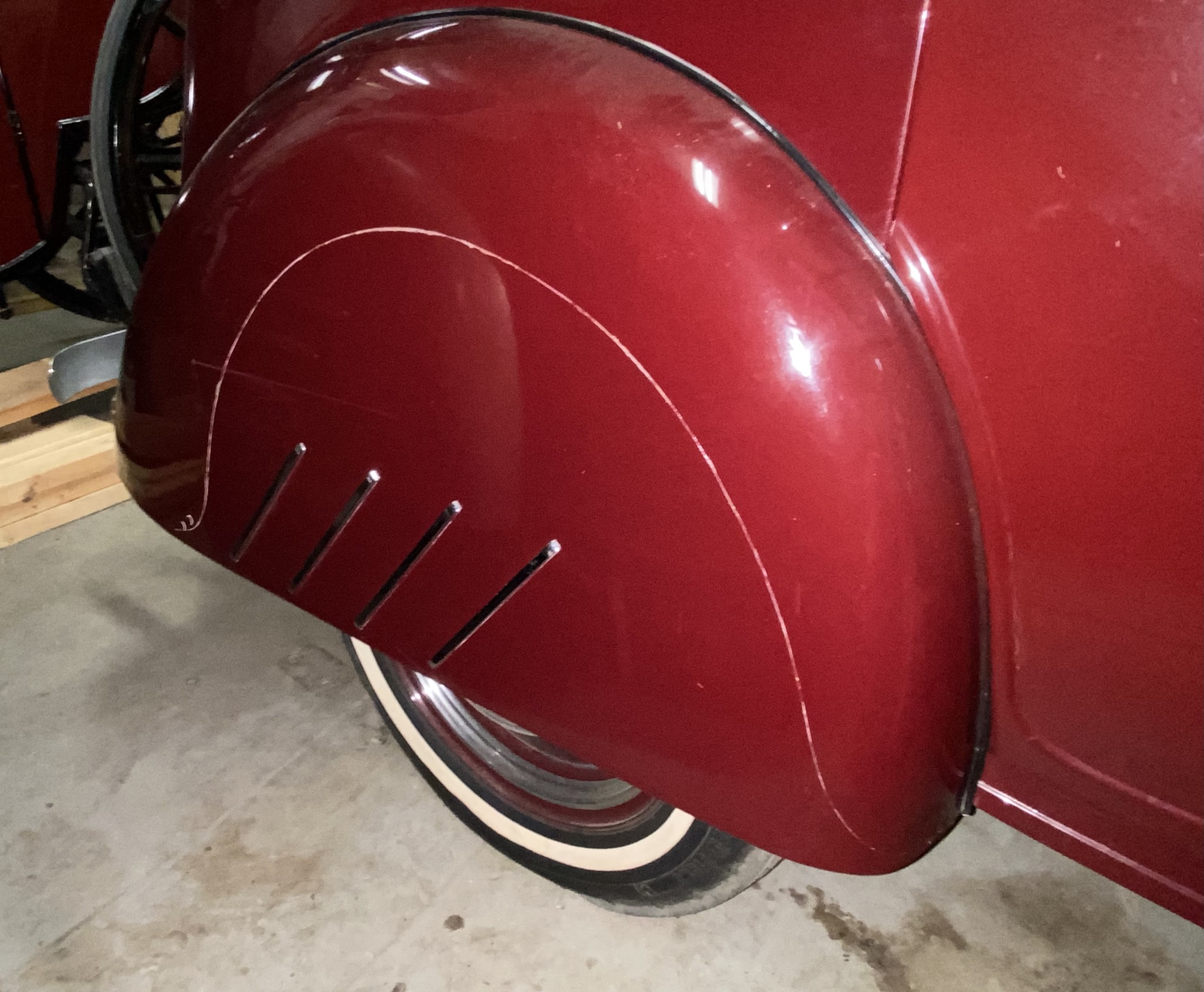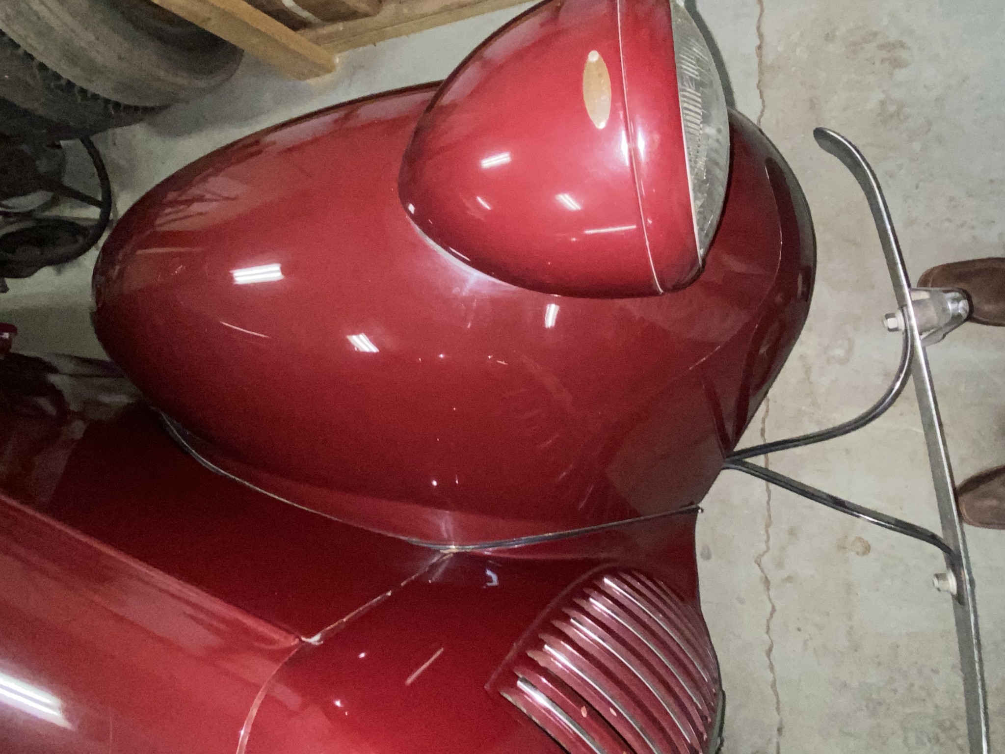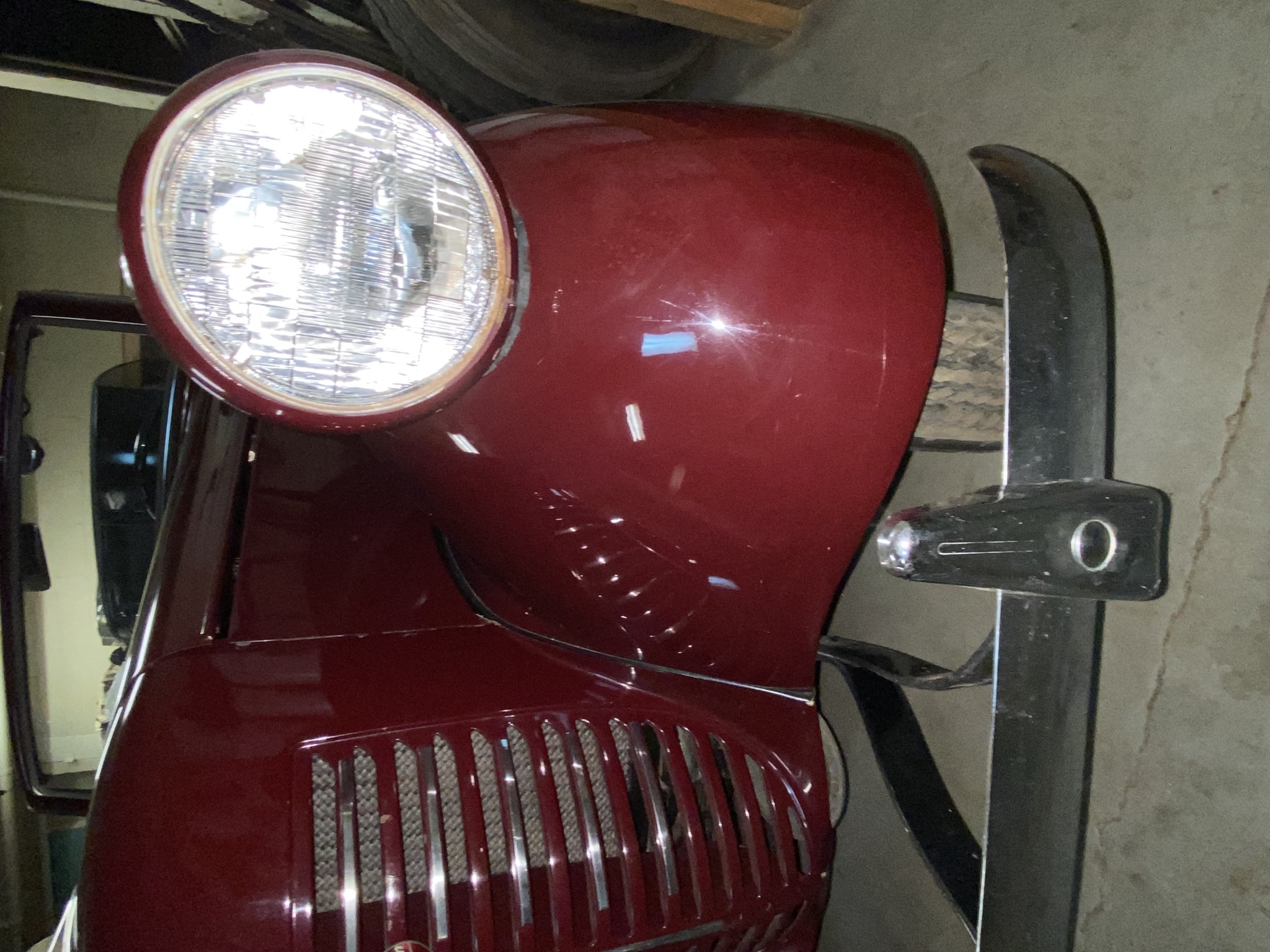 Seller’s Description: Nicely restored American Riviera Hollywood done in burgundy over burgundy interior with cream faced gauges. Excellent cream top with burgundy piping and glass rear window. Rear mounted spare, with spare tire cloth cover in matching cream fabric.