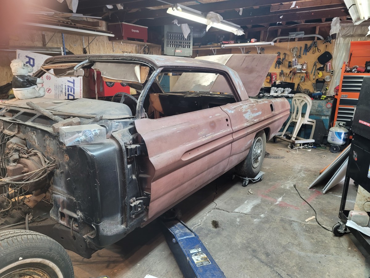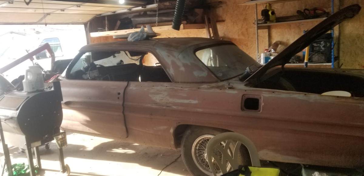 Seller’s Description: Pontiac Grand Prix. A rare triple black 389 with air conditioning. This car isn’t a difficult rebuild as the floor pans are great but does need a trunk pan installed and I have that and it goes with the car. I knocked some mud off the frame and found a small rot area which is shown in the pictures other than that the frame is fine. I took the motor apart and have it all boxed up. It’s free and the pistons are out of the block. The fenders are perfect but came off of a Bonneville so you’ll need to fill the trim holes. My wife said we had to many cars and I needed to sell one….it wasn’t a pretty sight when she got home from a seminar and I sold her Escalade!!! she should of been more specific. 630 four o one ninteynine 20 Ron
