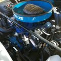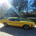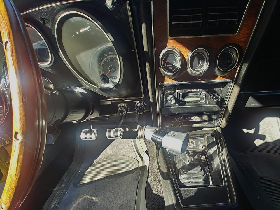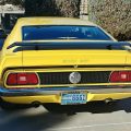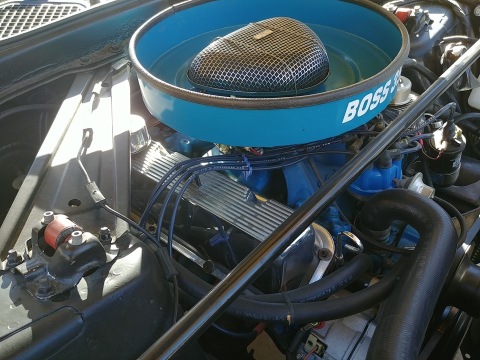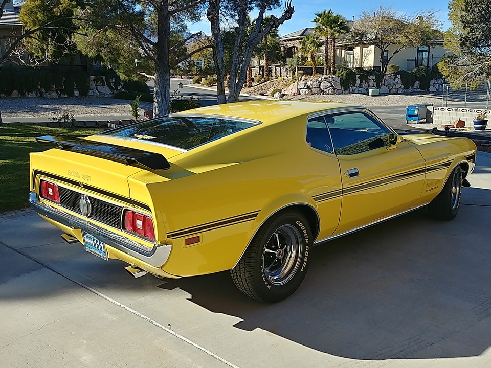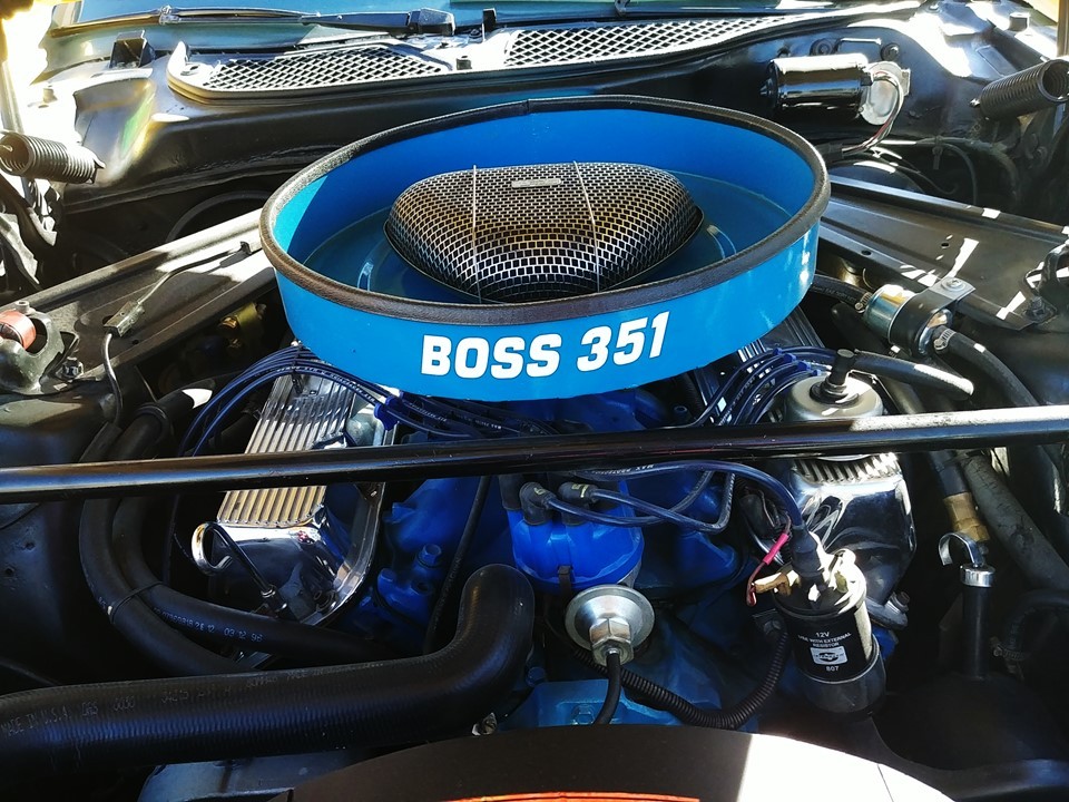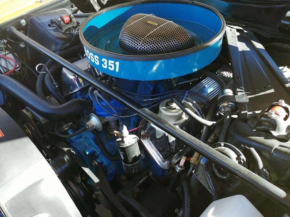 This Mustang Mach 1 is a tribute car, built to the specs of the Boss 351 issue from Ford. The VIN is 1F05H156380. This car left the Flint assembly line with a 351 Windsor mill, but that was kicked to the side of the road when this Mach I was discovered 30 years ago in disassembled condition. Over several years it was completely renewed and painstakingly rebuilt and reborn. It now has strong running gear that gives the kind of performance as the factory components: A fully rebuilt 10:1 compression 351C HO mill rated at over 300 horsepower; Hurst shifted top loader 4-speed manual transmission; TractionLok 9 inch rear end; Ram-Air hood, front air dam, and rear spoiler. With front and rear sway bars, Koni shocks, frame connectors, heavy-duty leaf springs, and aluminized tailpipes and mufflers, this Mustang looks like, and performs like, the factory-built Boss 351. The only real difference is the price.