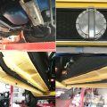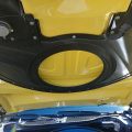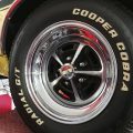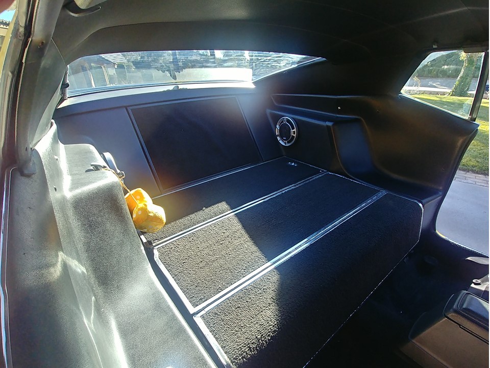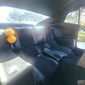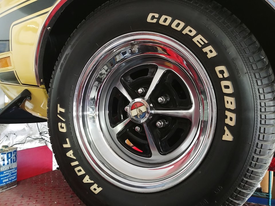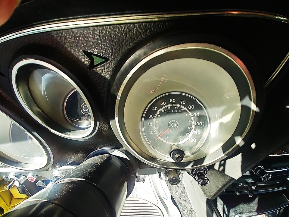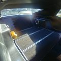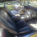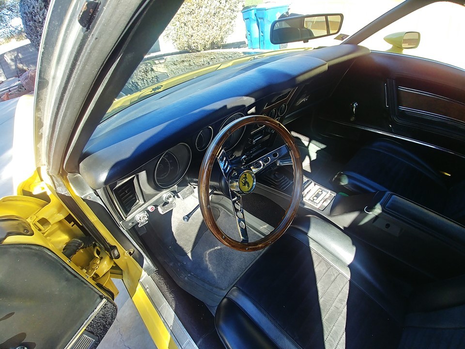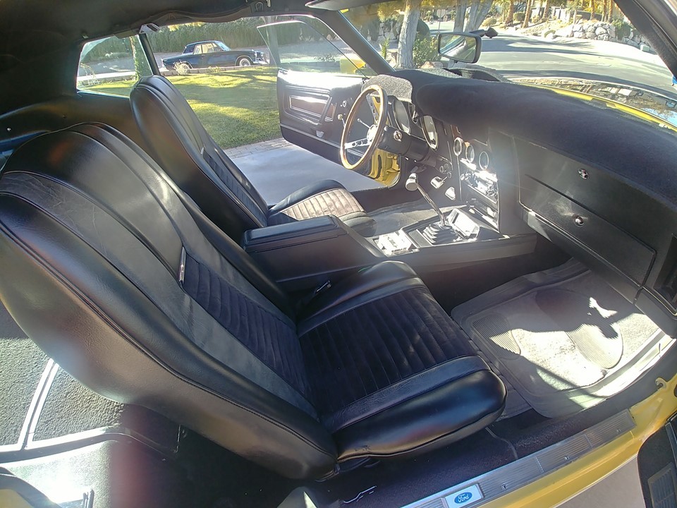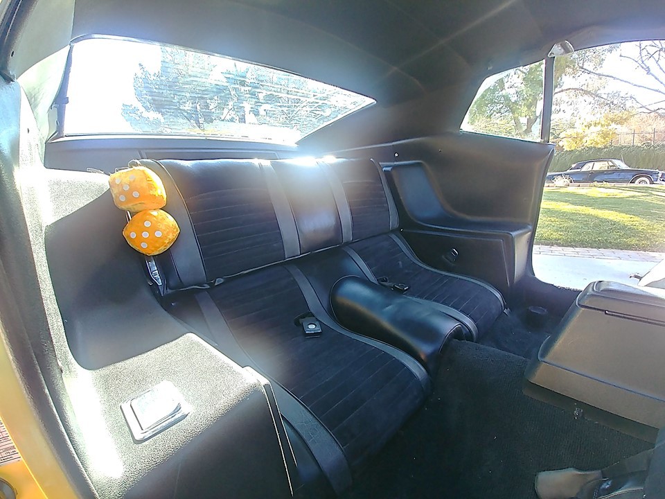 Inside, the car has flawless black vinyl and suede bucket seats, excellent door panels, dash cover, and headliner, an optional fold-down rear seat to make plenty of room for luggage on road trips, new carpeting, excellent glass, and tight-fitting doors and windows. The Grabber Yellow paint is flawless, trimmed in glossy black. There are some minor custom touches from 71 to 73 models (grille mesh, pop-open filler cap, for instance). The factory issue Magnum 500 styled steel wheels are like new. Though the tires have several years on them, the tread shows zero wear. There is not now, nor has there ever been, any rust in this car. The sheet metal, floor and trunk pans, and frame are pristine.