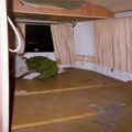 Seller’s Description: Old, but the body is not too bad! Missing passenger seat. Has fold-out rare upper cot. It has some good parts. Has unusual swing outside the door, that works well. Canvass on pop up has bug holes but is reparable. No motor. Repainted to protect the body, now peeling. Had been used for the storage of tools. Clean and empty now. Missing a lug nut or several, stolen.