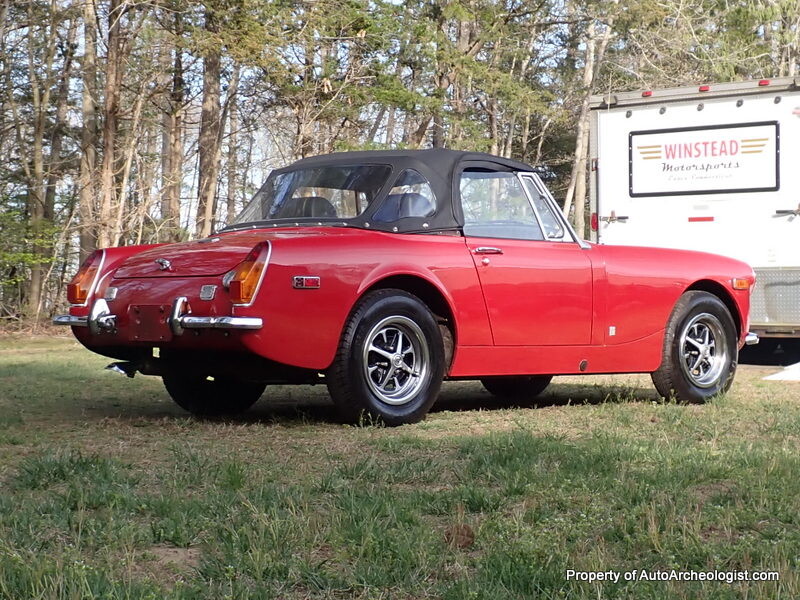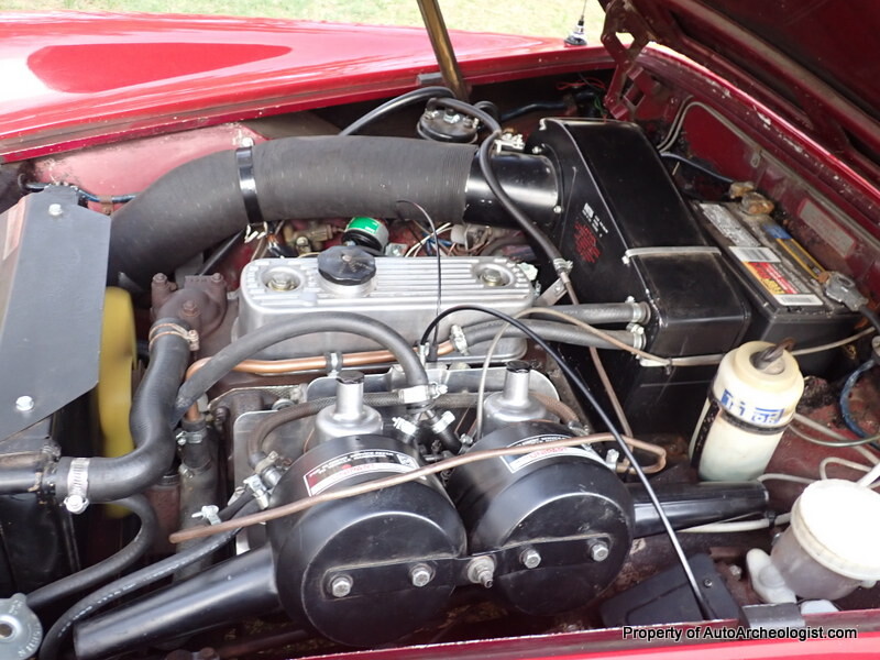 Everything about this car is good. Solid body, nice, even paint, top is like new, seats are pretty firm and have no tears, the padded dash is also tear/crack free. The tires are a “Metric Radial” in a 13″ size and are in great condition, wrapped around the stock Rostyle wheel. The air cleaner and twin SU carbs funnel the fuel into the 4 cylinder under an aluminum valve cover and out through a straight pipe exhaust and a sport muffler. Disc brakes up front and drums out back bring her to a halt. Nothing power on this little car, that you put on and wear more than get into, especially if you’re over 5’10”, once in though, there is plenty of leg room. The roll up windows work as they should, the top folds down easily, you can do it all sitting in the driver seat. The lights all work, wipers, heat/fab, even the horn.