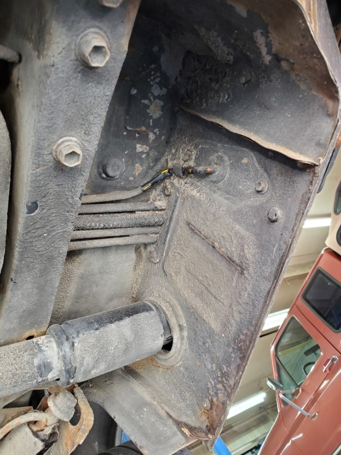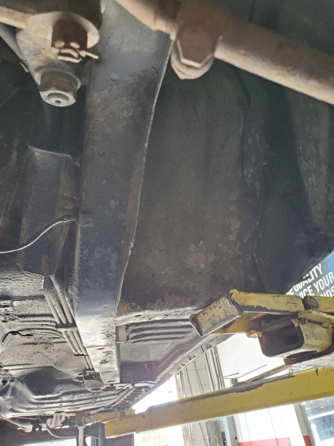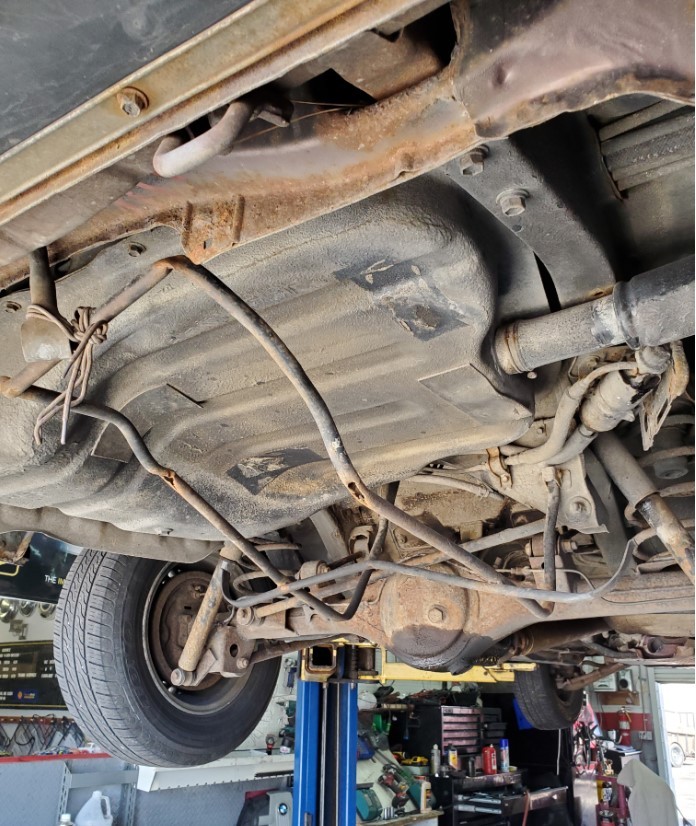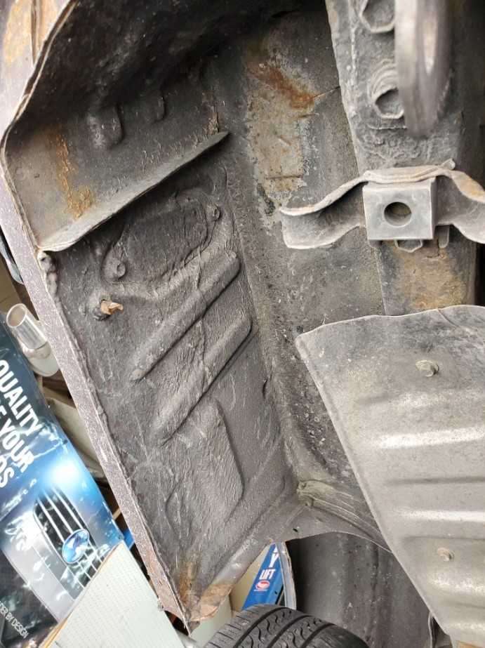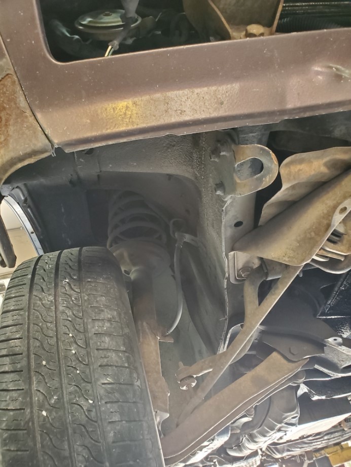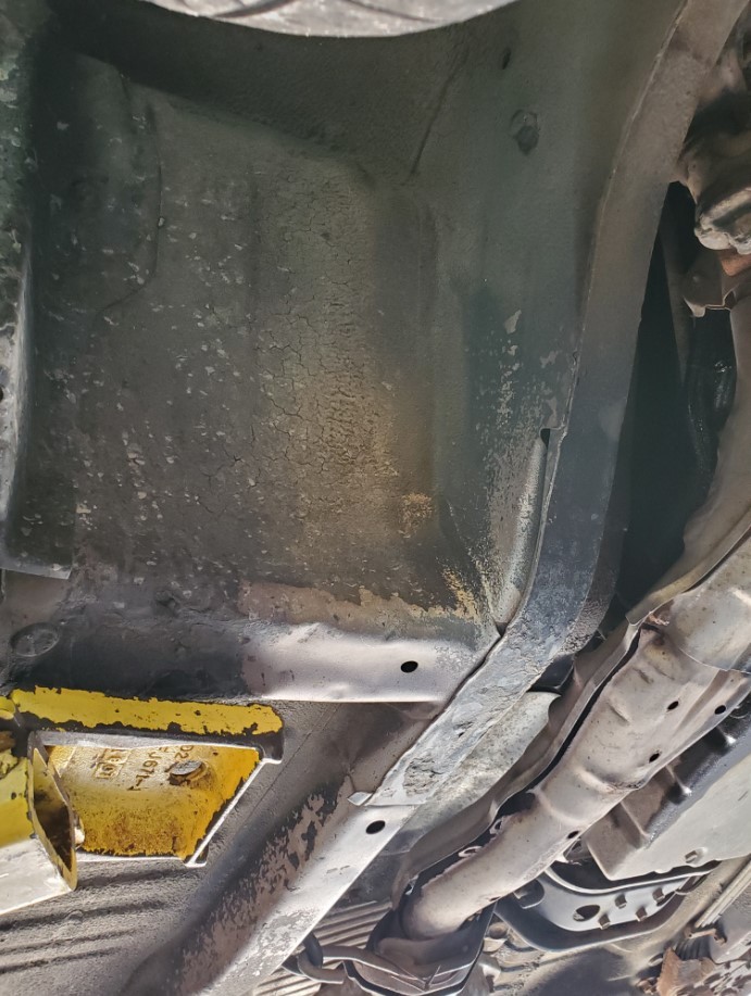 The underside is rust-free and in amazing condition. The topside has rust on the front fenders, some surface rust on the rear hatch, and a small dent on the passenger rear quarter panel near the rear wheel. The windshield is cracked. The rear hatch window is missing a corner trim piece.