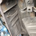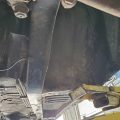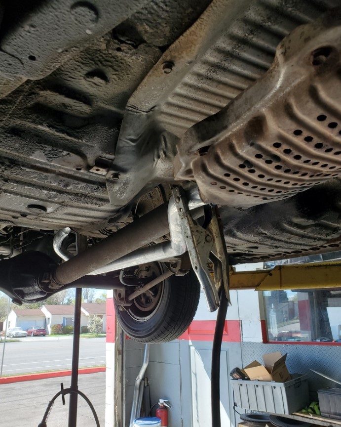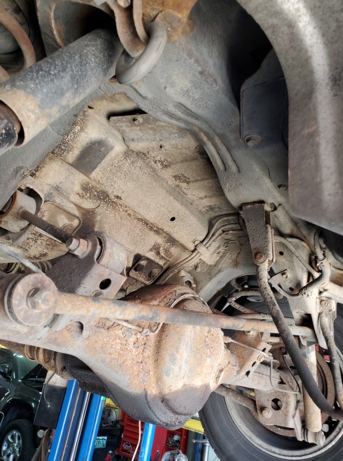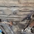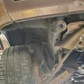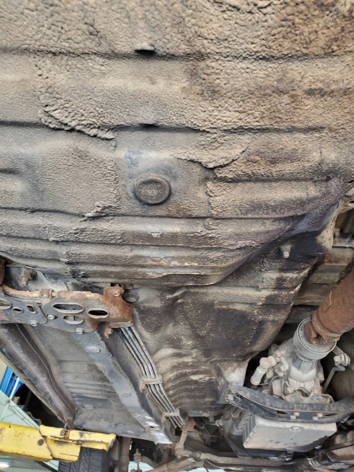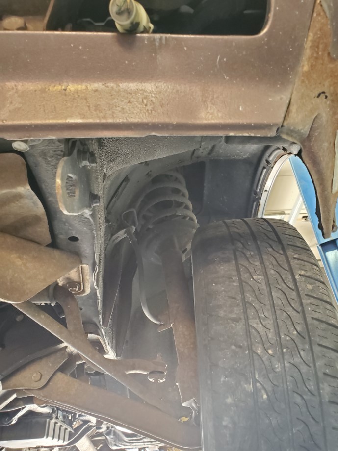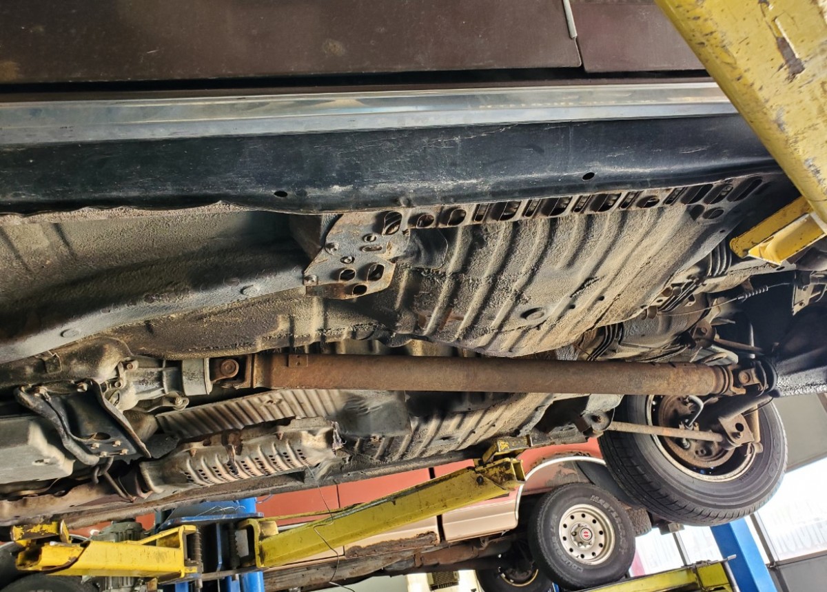 The underside is rust-free and in amazing condition. The topside has rust on the front fenders, some surface rust on the rear hatch, and a small dent on the passenger rear quarter panel near the rear wheel. The windshield is cracked. The rear hatch window is missing a corner trim piece.
