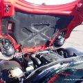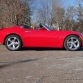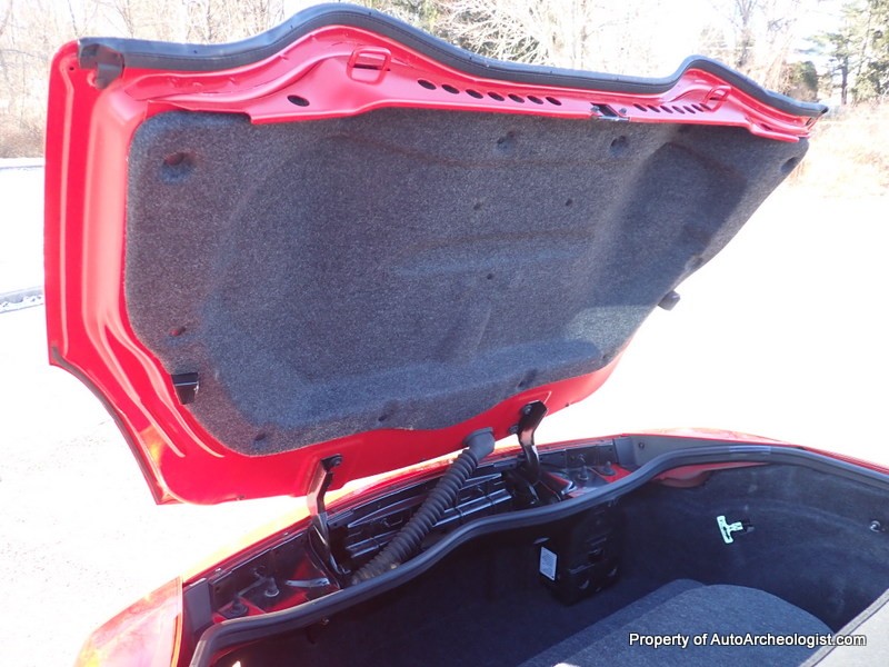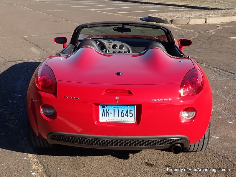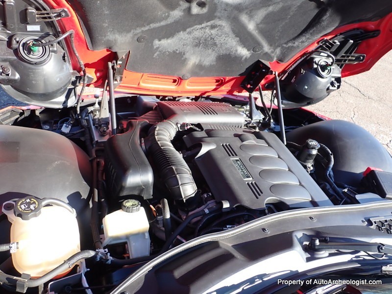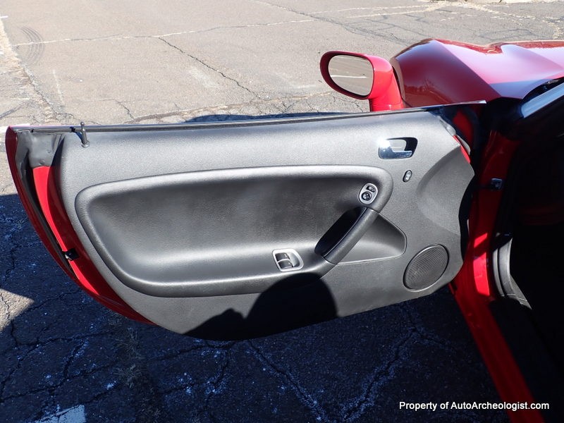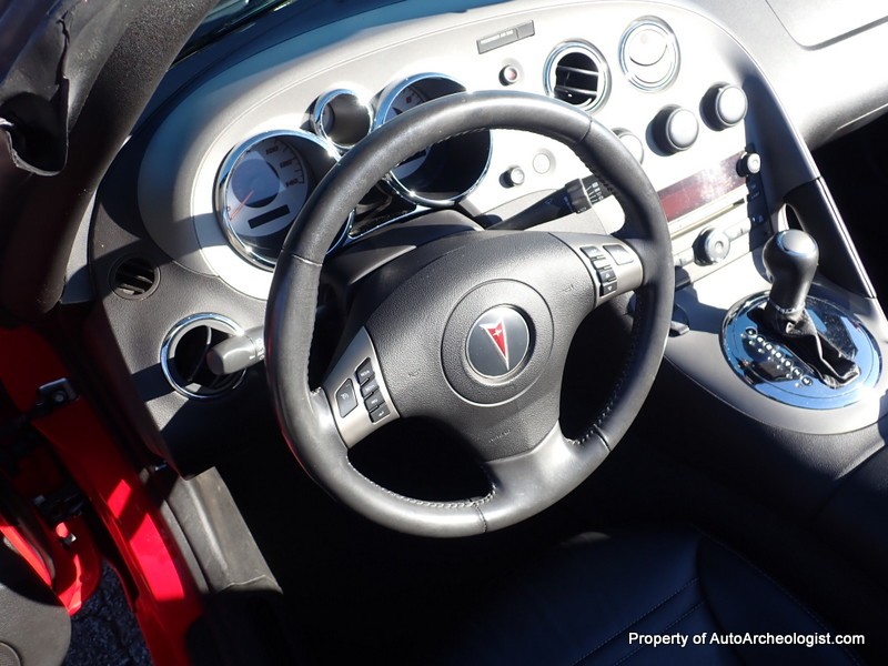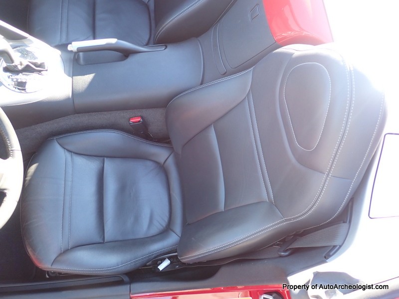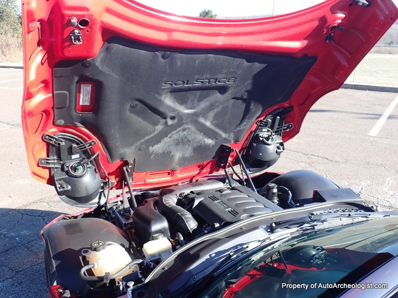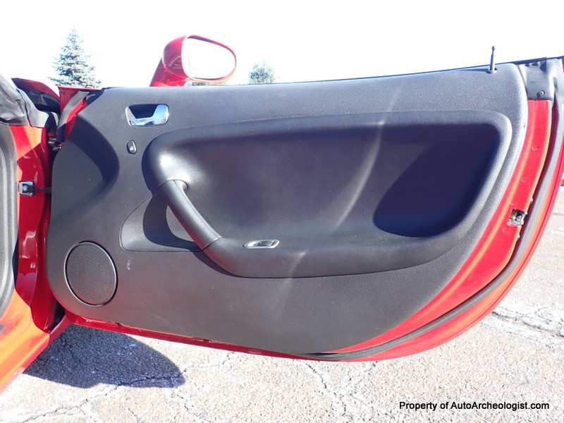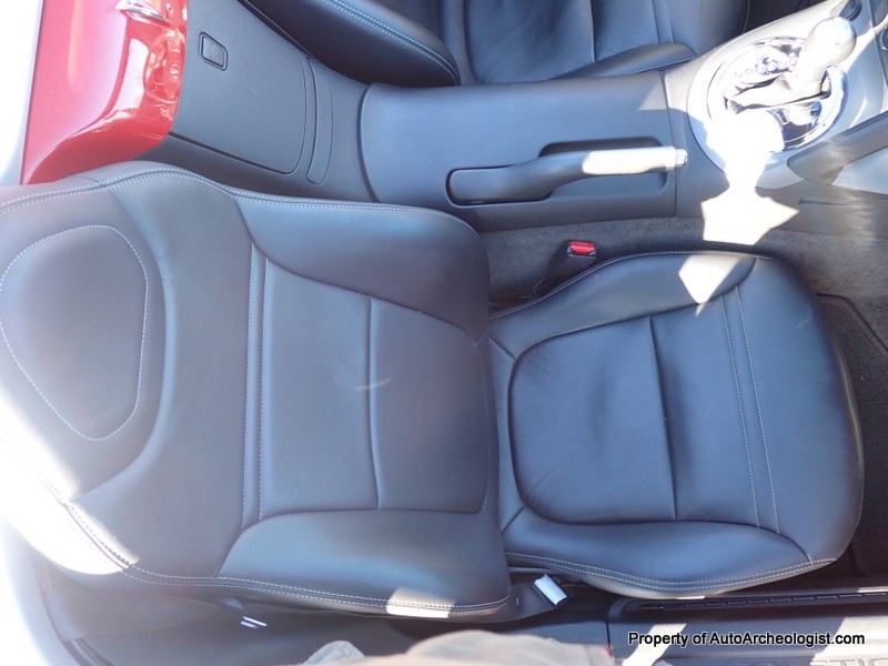 This Agressive Red Solstice certainly looks the part of a car with less than 25K miles. The Ebony leather interior is near perfect, aamof, I didn’t notice any flaws in my time with the car. The red paint does show a couple very minor imperfections; there are 3-4 very small stone chips on the flip front clam shell hood, a very small scratch/rub on the pass mirror and a small scratch on the door just in front of the mirror. These can most probably be compounded/buffed out. The worst isn’t visible unless you’re on your back looking at the couple of curb scuffs under the chin spoiler.