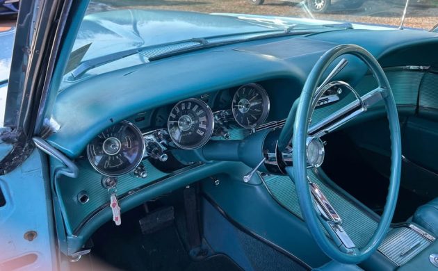 The Thunderbird’s turquoise interior is in very good condition and compliments the exterior paint perfectly. The cool, jet-age styling is evident without being over-the-top. This one was ordered with the new optional Swing-Away Steering Wheel. This $25.10 option would prove to be so popular that it became a standard feature in 1962 production and continued for the next four years.