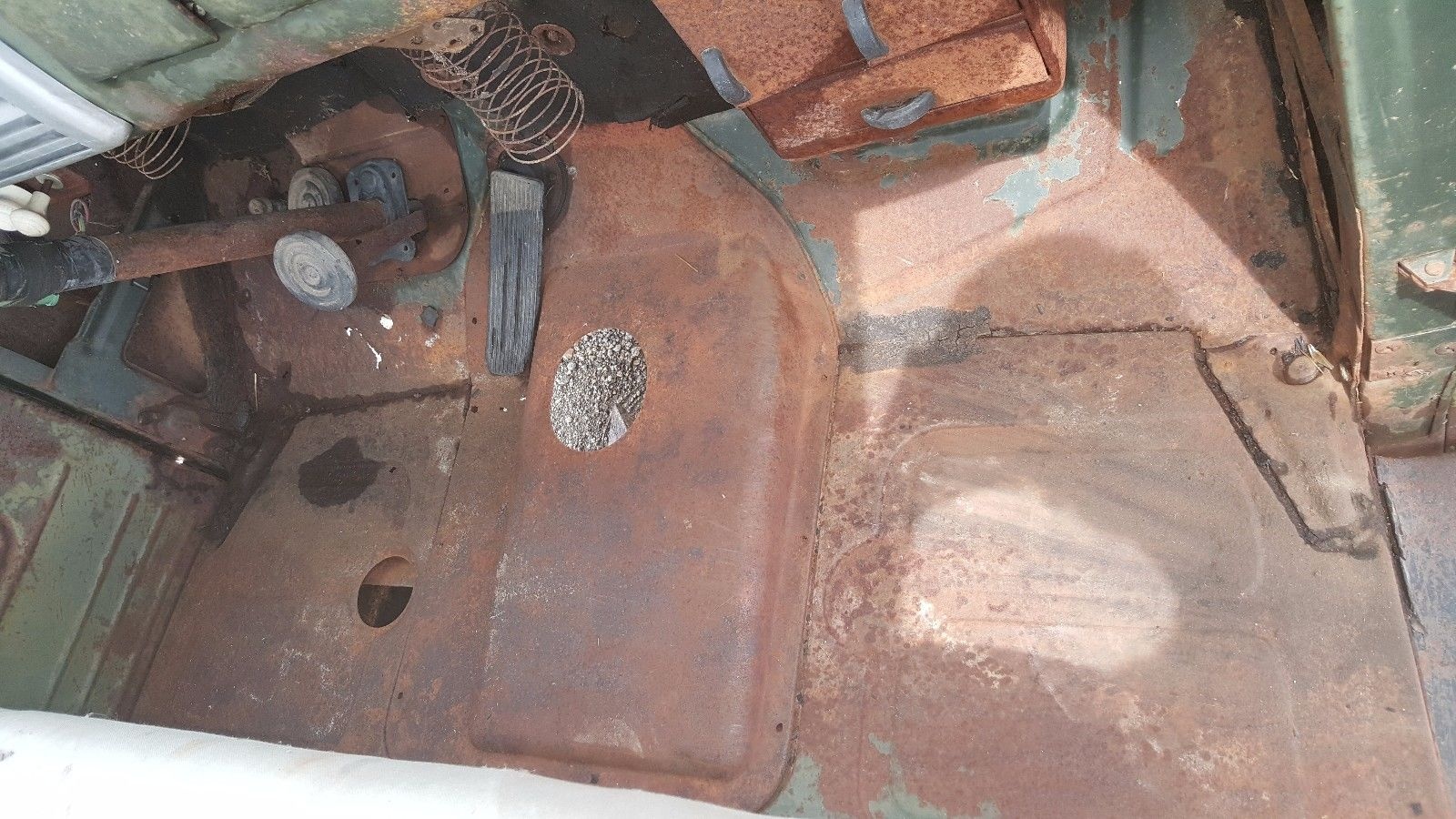 The truly remarkable thing about this truck is how little rot there is in the body. There are no holes that I can see in any of the seller’s pictures, which by the way are well taken and give a good idea of the trucks condition. In the top of this photo you can spot the add-on heater and what is left of the paper ductwork under the dash. While still an option on this era truck, I am sure heaters were a necessity on these Canadian marketed vehicles.