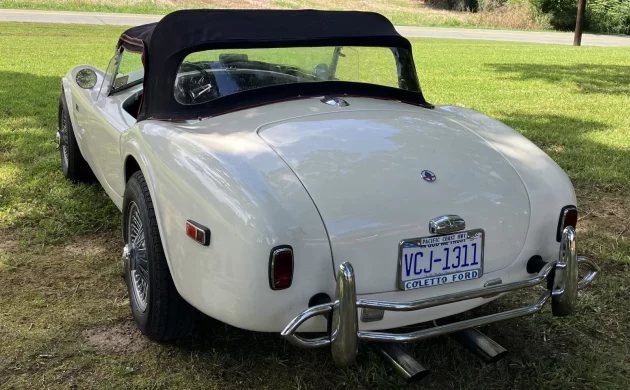 Looks better than the typical over-blown Cobra kit car with chrome roll bar, gaudy paint, big flares, sidepipes, etc. Unfortunately, the impact bumpers spoil the looks, but the mounts could perhaps be modified to get the bumpers closer to the body. Other external details differ from the original (back-up lights, fuel filler, etc.), and the dash is different. Price seems in the ballpark, and the owner has probably not had many bites, so haggling might lower it.