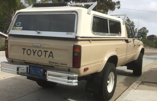 The ‘Yota is living in sunny California, likely a big reason why it has survived so well. The larger tires and aftermarket rear bumper point to a life of regular use, but neither deviations from stock are deal breakers, and they both look quite good. White off-road style wheels are a typical (possibly stock?) design for this era of Toyota, and factory lettering and 4WD decals present well.