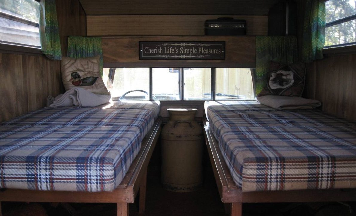 I think the pillows and sign in back are problematic. The milk can between the beds? If it’s a ‘potty’, bravo. Plenty of volume for drink-camping. Or is it camp-drinking?