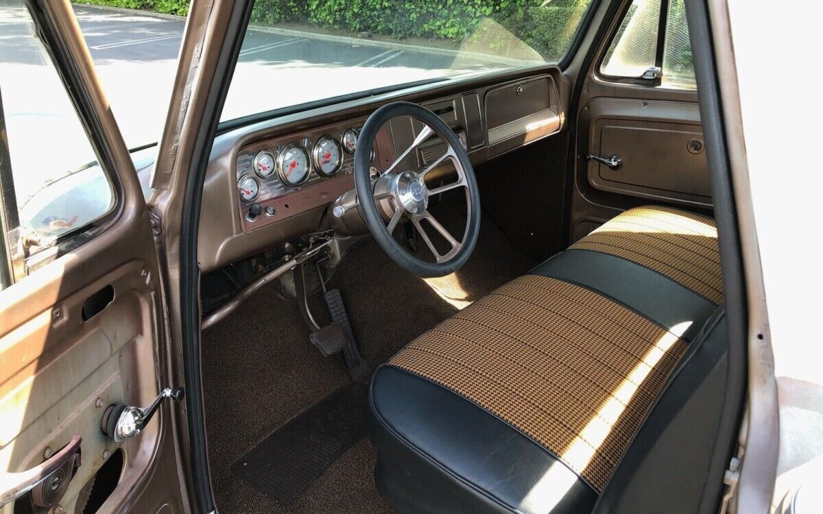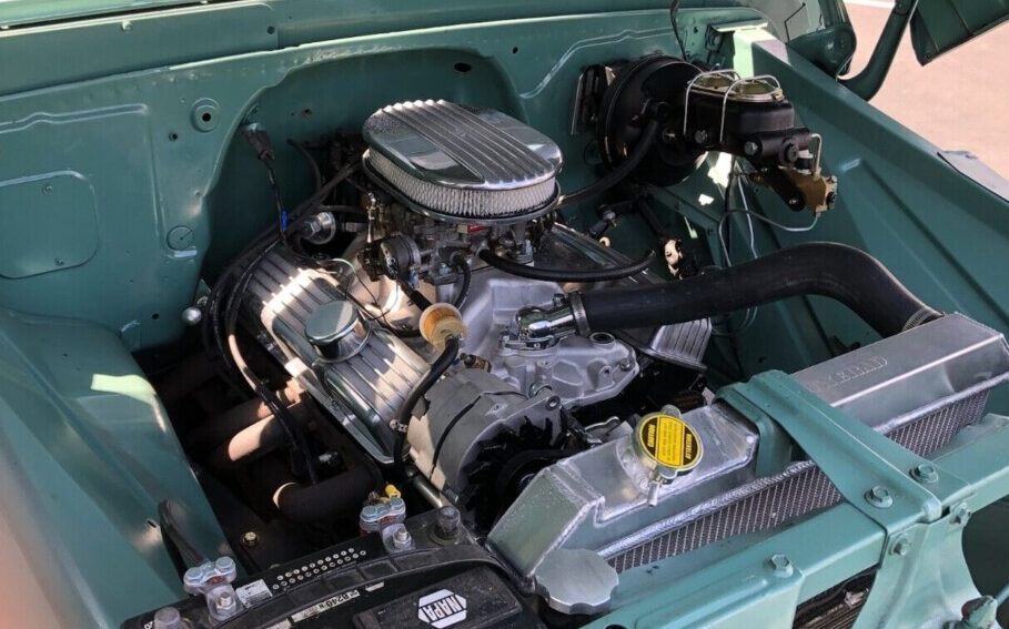 The engine is a 350 crate motor that has some typical dress-up items like the finned aluminum valve covers and air cleaner cover. You can see the engine compartment is pretty clean, which takes a bit of TLC to do. Power steering and power brakes are also present, which I’m sure makes this truck fun to drive. The transmission is a Turbo 350, so you don’t have to worry about shifting gears. The aluminum radiator is a nice upgrade to keep the truck running cool in the California heat.