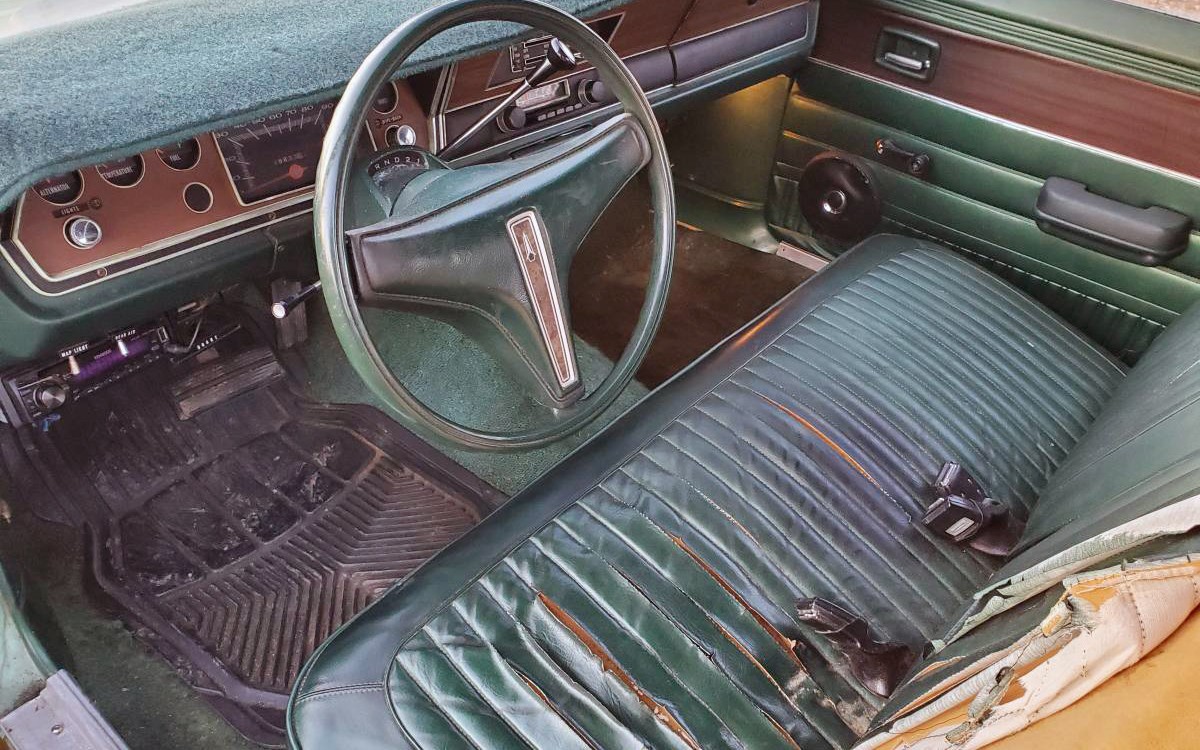 There seem to be similar dents in the leading edge of both front fenders for some reason, like someone tried to pick it up with a big pair of pliers. Otherwise, I don’t see any dents or areas of concern. A couple of chunks-o-trim are missing but that should be easy to redo after you fix the pliers dents. One area that is of concern is lurking under everyone’s favorite feature of 1970s cars: the vinyl top.
