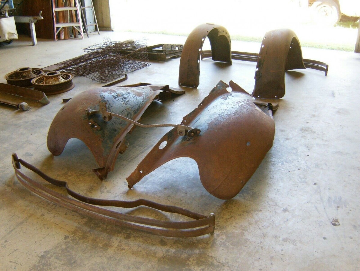 Another problem is that the front fenders had a section cut off for some reason. It looks like the chopped parts were kept, and these can be welded back on by a welder with some skill. Welding sheet metal is an art, and it takes a patient welder to do it correctly. Other than the unexplainable butcher work, the dismantled parts look to be restorable. Chrome work would be costly, but at least the bumpers are there and appear to be straight. The seat springs also look like an upholsterer can use them. As for the running board, a duplicate shouldn’t be too difficult to fabricate.
