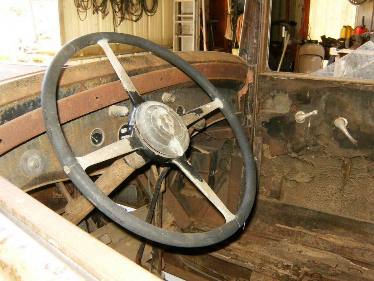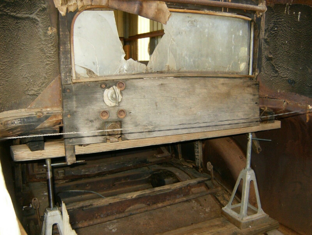 In the rear of the interior, we see where the current owner has temporarily jacked up the body to keep it from sagging. While this is not a good problem to have, we can see that the relative simplicity of the interior would make rebuilding this support structure in wood or steel a fairly straightforward repair. Something would have to be done before the car is transported. Those jacks wouldn’t stay in place long on a bumpy ride, and the shaking action would probably damage the unsupported sheet metal. The open floor also makes me wonder if this car had a wooden floor rather than stamped sheet metal.