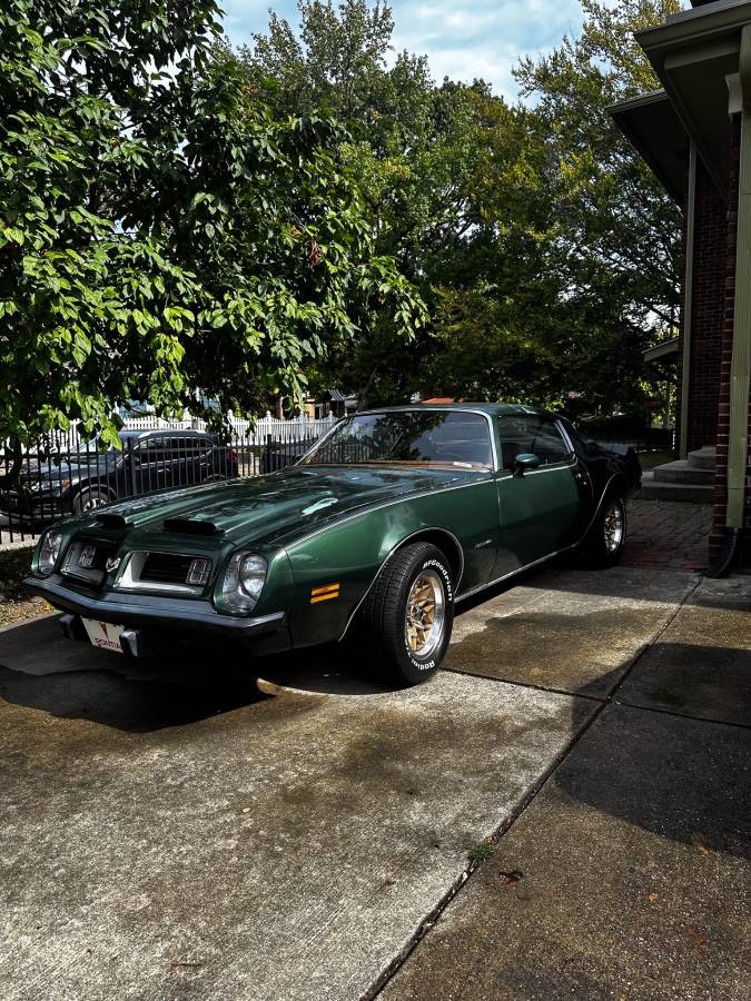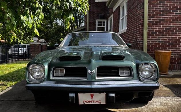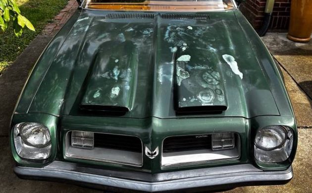 Of the 84,063 Firebirds built in 1975, only 13,670 were Formulas. This was the first year of the wrap around rear windshield on the second generation Firebird. The paint on this car is damaged and faded. If it is the original paint, it is Code 49 Alpine Green. This angle shows the dual snorkel hood scoops which were no longer functional in 1975. The wheels on this car are Pontiac 15×8 aluminum snowflake wheels that were not introduced until 1978. The car has been listed for 2 weeks.