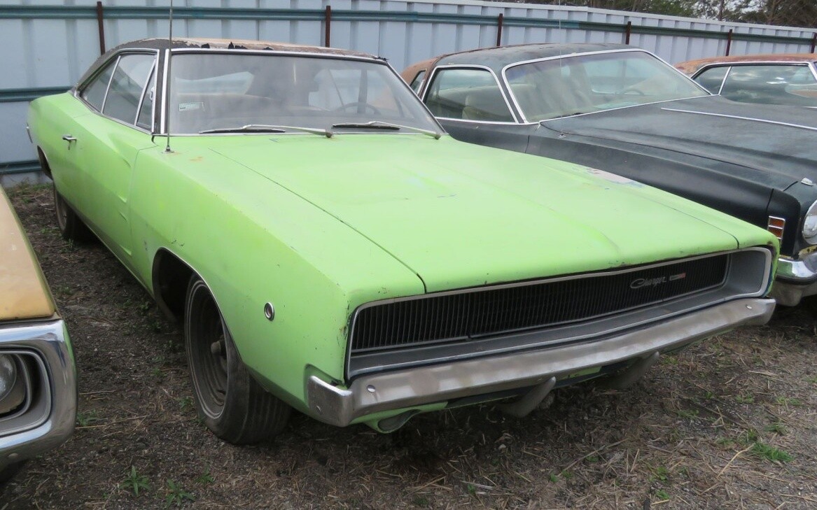 Mopar enthusiasts won’t be disappointed as there are a handful of Chrysler products too, including this 1968 Dodge Charger. Originally blue, somebody painted the exterior Sublime Green, and even though the vinyl top is showing some wear, the half of the body we can see actually looks pretty good. It’s got a non-running 383 engine and a couple of goodies inside such as bucket seats and a Tic-Toc-Tach.