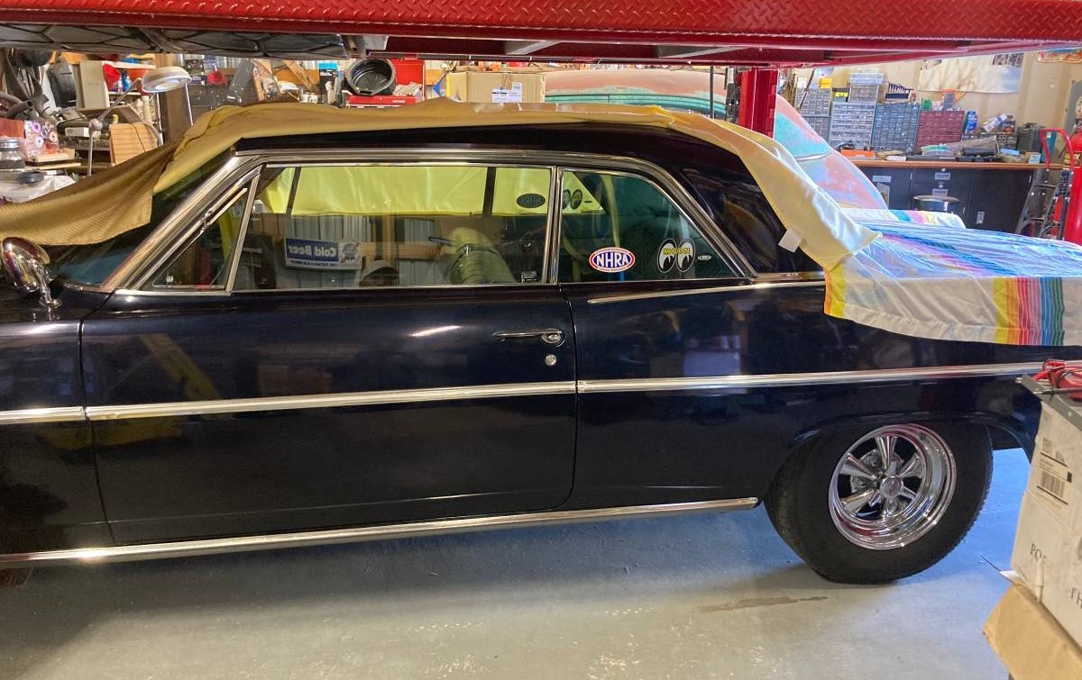 1963 Pontiac Catalina – black in color, stored indoors and covered, and fitted with aftermarket wheels. It looks like a gorgeous car that might very well be a sleeper of sorts with a 389 cubic inch V8 along with an automatic transmission lurking under the hood.