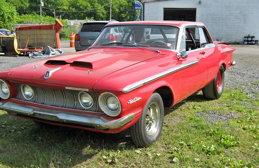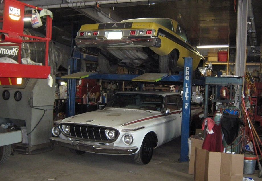 1964 Plymouth Fury – this is the black car sitting atop the ’62 Polara on the lift. It looks to have been kept covered and the rear wheels are the only sign that this might be a racer, as well.