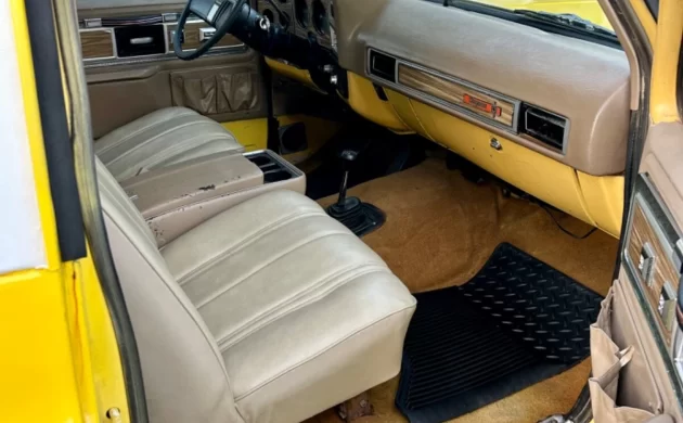The seller goes so far as to call it a “rough old driver” which almost seems too harsh to me. It doesn’t look that bad, but I also recognize that things can look better in photos. The carpets appear to be in decent shape and while there are some rips and tears in the seats and the center console, it’s all serviceable. The paint on the lower portion of the dash does look like Colonial Yellow, so it’s clear in this photo that the yellow used in the respray is a fair bit brighter than stock. Shockingly, the door map pockets don’t appear to be sagging and the wood trim around the instrument cluster is intact.