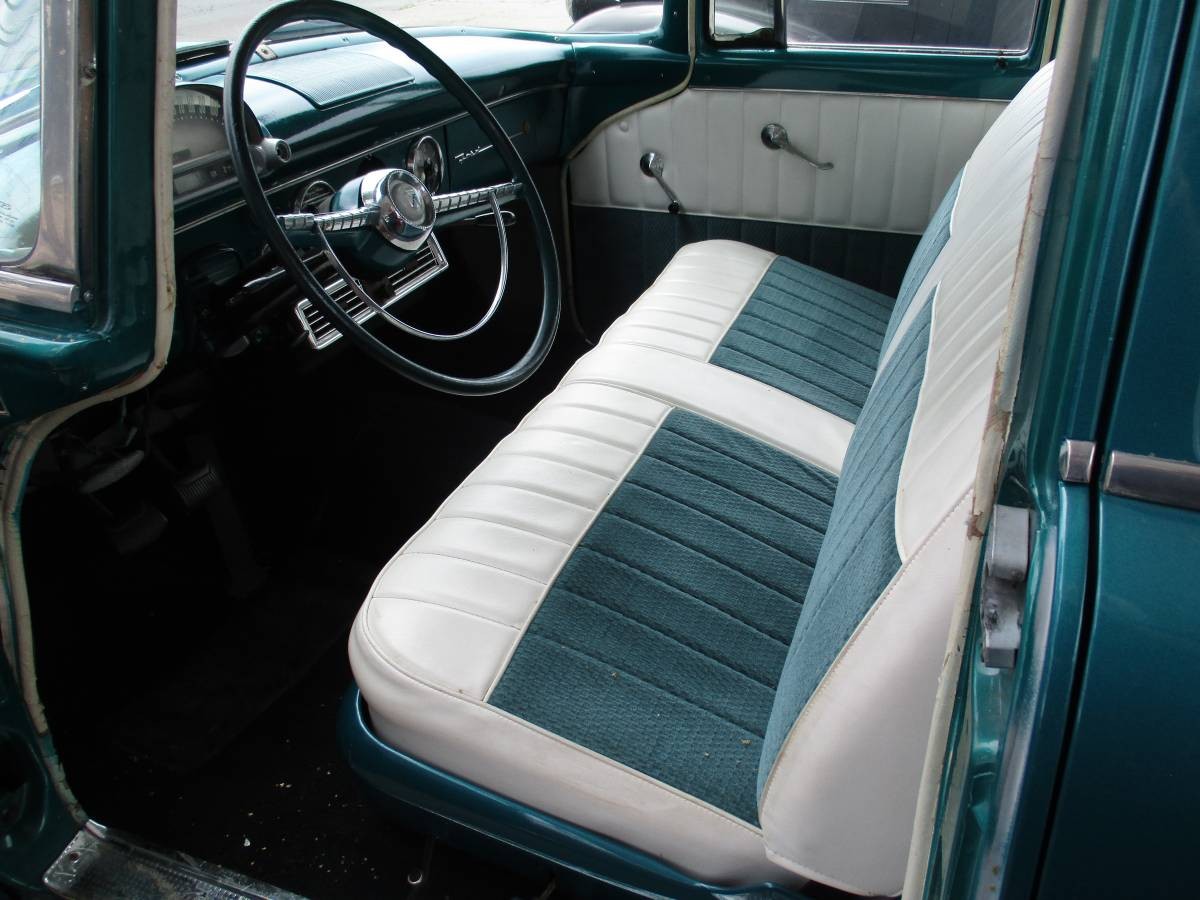 This car is a long way from original. Paint, interior, trim details, AC, etc. The original Coral is not pink, it tends more toward the brown. Ford did offer a bright pink in ’55, you see it a lot on Crown Vics, but this wasn’t that color. The color it’s painted now is not blue, nor is it Pine Tree green. It’s a dark Turquoise that was never offered stock. Looks ok, but again, not original. I don’t mind the six-cylinder engine; the 223 was a good motor. The overdrive is rare now, and a big plus.