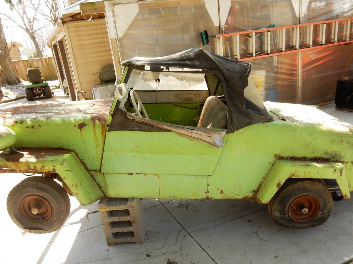 The King Midget you see here is one of the updated 1966 models. The option list was undersized to say the least. While a windshield wiper was one choice, I am pretty sure leopard print seat covers weren’t on that short list. Neither was lime green paint. Perhaps the white that is seen underneath the flaking green is the original color. Whoever owned this car previously must have liked attention. Riding down the road in a King Midget should have garnered enough looks, but adding the combination of lime green paint and African animal inspired upholstery must have been a teensy bit too much.