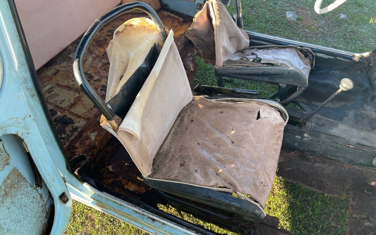 Inside is where more eyebrows will start to be raised. First, we don’t get a photo of the dashboard, so the instrument panel’s condition is unknown. But we do get to see photos of the floor, and it’s not a pretty sight, with the driver’s seat about ready to fall through and the passenger chair hanging on by a thread. The seller thinks the deterioration was caused by moisture getting under the vinyl floor mats, and if there is any good news here it’s that the sills themselves are said to still be in good condition, although I’d check them very carefully before welding new metal in there.