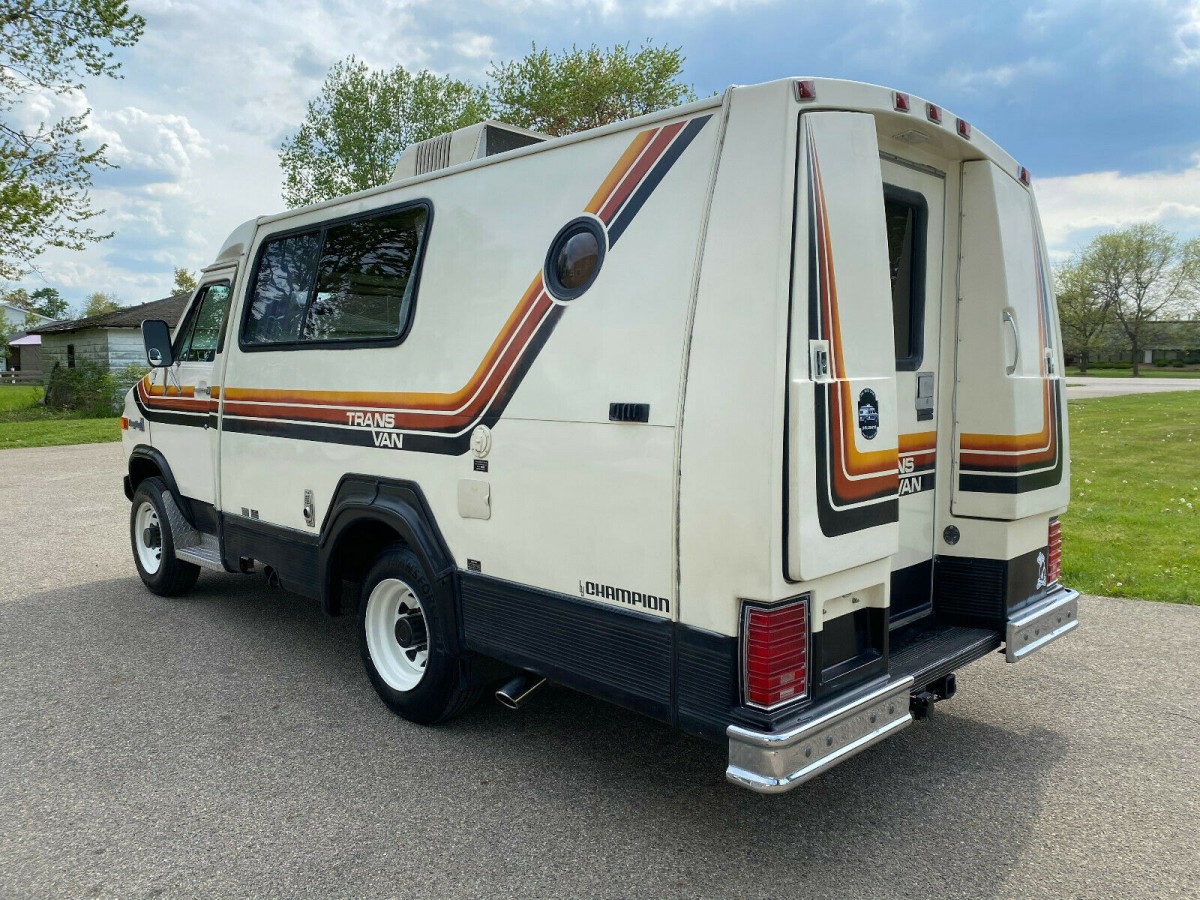 The Trans Van was built on a few different chassis, including those from Ford, Dodge and Chevrolet. Each used the same basic recipe, with the standard front cabin space preserved and a custom body by Champion added with the off-the-wall stripes kit you see here. That’s what always impressed me: no matter which model you ordered, the Trans Van kit maintained the same consistent decal theme. What’s even cooler than the outside appearance is the robust construction: TransVans body frames were constructed with steel beams, not the flimsy wood like most RVs that would quickly get wet and fall apart shortly after water intrusion began.