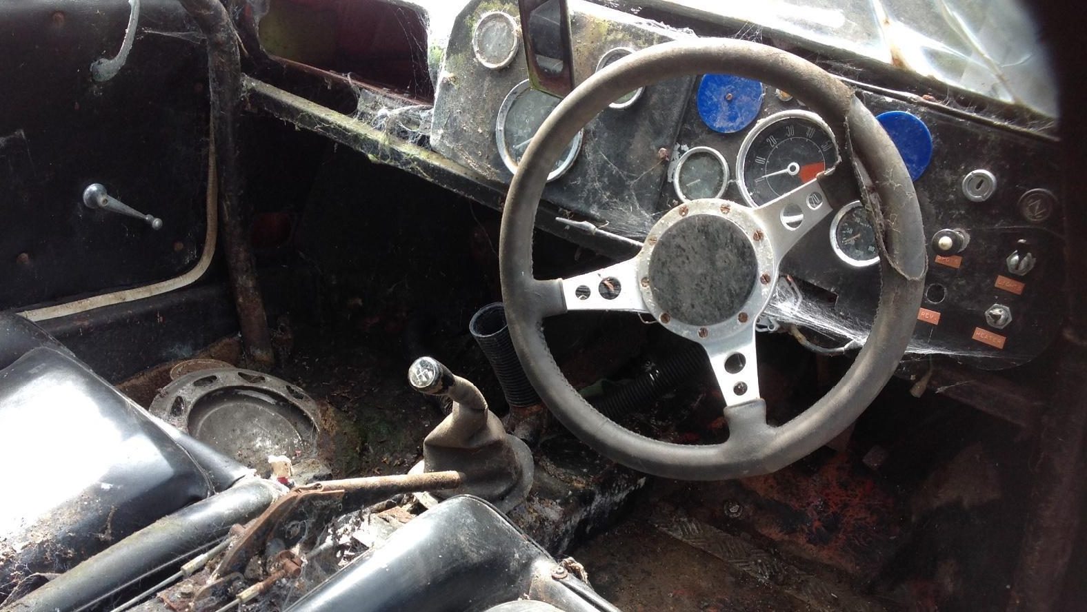 Inside, some extra gauges have been added and that is a wicked period sport steering wheel. It looks as if there are some quick shut-off switches as well. The whole car has clearly been off the road for some time as evidenced by the cobwebs that have set in, and the seller notes it unfortunately has some rust issues as a result: both subframes are rotten, and some of the glass has been damaged as well. Fortunately, much of the Mini Marcos’ construction was shared with the Mini of the same era, including the subframes.