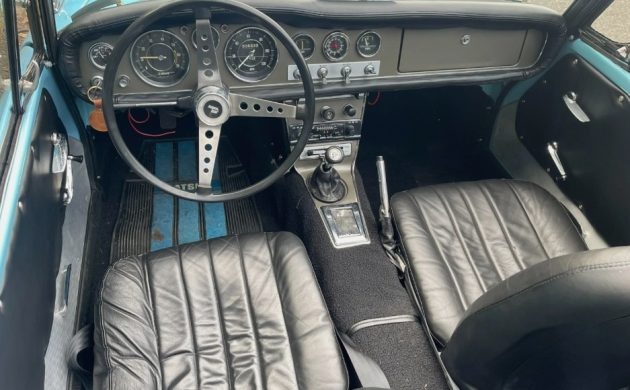 The straightforward layout includes bucket seats separated by the transmission tunnel, a full assortment of gauges, an emergency brake lever nestled next to the passenger’s seat, a three-spoke large-diameter steering wheel, and an ignition key on the left. The lower portion of the door is aluminum with a simple stationary door pull – a design feature that carried through production of the 1600 and the 2000. Panel gaps are decent though not perfect, but you’ll see much worse than this: these roadsters were not known for build quality. The car’s door jambs, underside, trunk, and other crannies are clean or easily improvable with a little elbow grease.