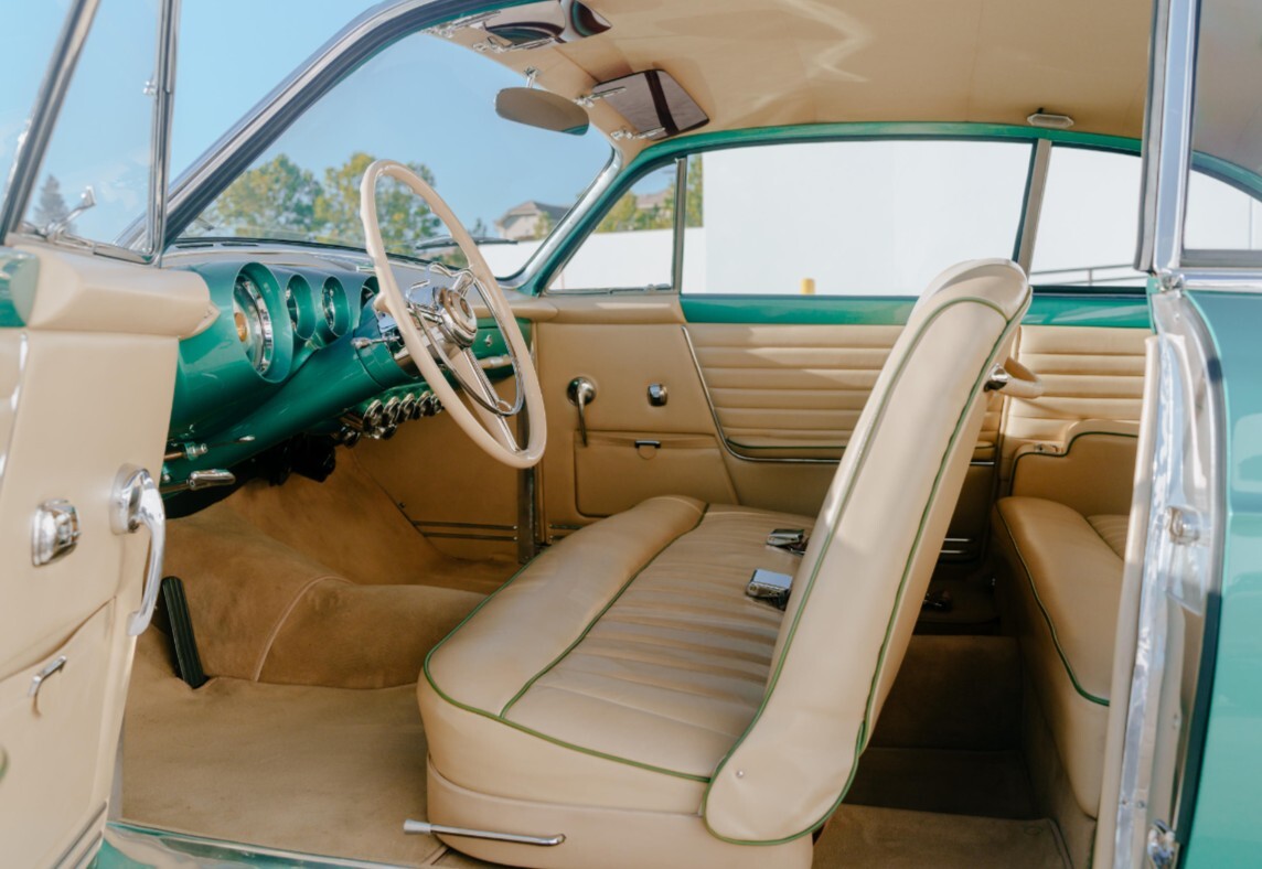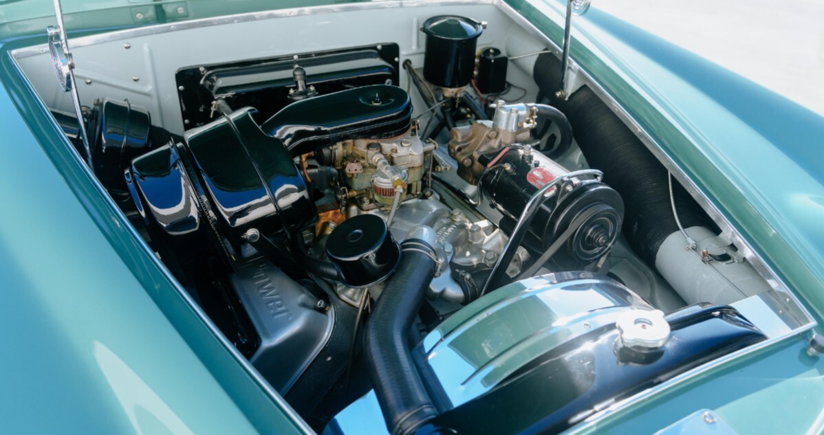 Devotees of the Chrysler hemi will know this engine as one of the progenitors of the entire breed: the 331 cu. in. FirePower V8, installed in many Chrysler models produced from 1951 through 1958. Here, it is coupled with a four-barrel carburetor. Horsepower is estimated at 180 and the transmission is a PowerFlite automatic, making this car a cruiser rather than a racer. As expected, the engine bay is as immaculate as the rest of the car.