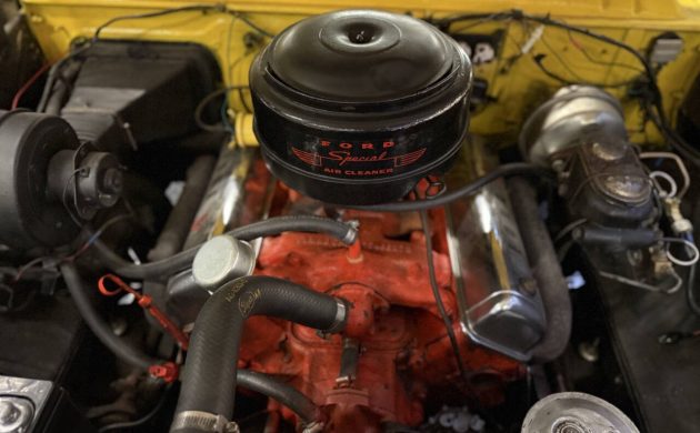 The tidy presentation and color combination set by this Ford’s exterior continues inside. The two-tone vinyl is bright and shows no evidence of wear or distress. The carpet is excellent, and the gauges feature clear lenses and crisp markings. The painted dash surfaces sport a few scratches, which is one of the few criticisms I can level. The interior retains its original radio, and aftermarket additions include a column-mounted tachometer, a gauge cluster, and a CD player located below the dash.