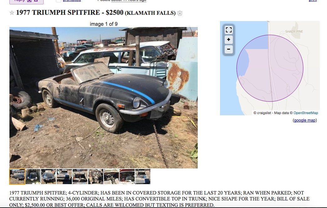 After my recent trip to the Washington and Oregon coasts, I remain amazed at the number of vintage cars hiding out there that remain in surprisingly solid condition. This 1977 Triumph Spitfire is another example of such a vehicle, still wearing its old-school Oregon plates and hiding out on the same property of the Alfa Romeo Spider we just featured. This car also looks surprisingly straight for its many years of outdoor storage, and is listed here on craigslist for $2,500 or best offer.