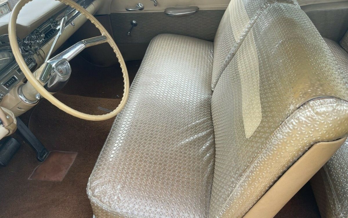 Inside is a bit confusing as the seller states, “carpets and headliner wrapped in the original bubble wrap“. I’m not seeing that but the plastic seat covers are hard to miss – and they’re not bubble wrap. Those were a very common ’60s accessory, our family BelAir had one covering the front seat to protect it from a younger sibling who had a tendency to ralph all over the place on long car rides. Talk about uncomfortable…especially in a non-air-conditioned car, you’ll stick right to them. The carpet does look like new, almost too new on this undisclosed mileage, 63-year-old coupe. The dash and instrument panel have that typical chrome-adorned, futuristic look that was so prevalent on upscale cars of this era. It’s in very nice shape!